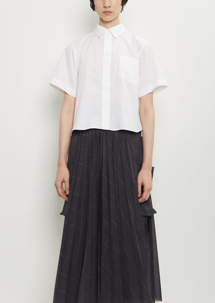 Sacai white short sleeve shirt with classic collar and a concealed button placket in cotton blend poplin. Features a single exposed button at neck, patch pocket at chest, three box pleats at back yoke, and panel at back hem for added volume. Finished with nacre-hued buttons throughout.