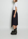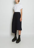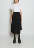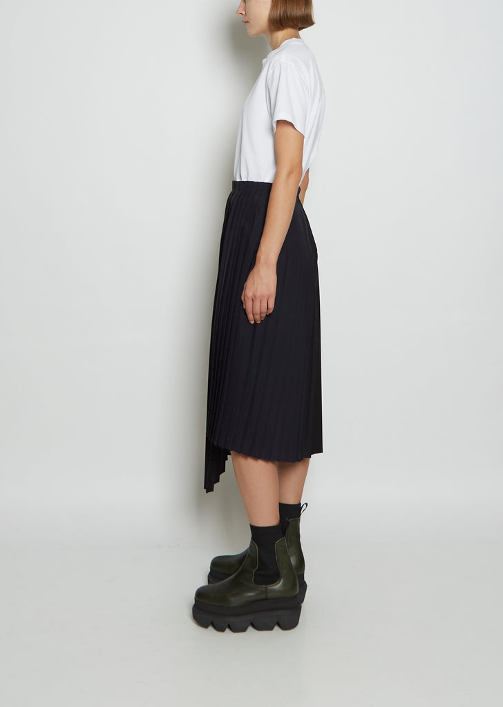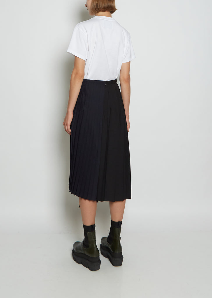 Sacai black pleated skirt with an uneven hem in a hybrid of wider accordion pleats at front-side in black and a shorter length narrow pleat in navy cut from fluid wool suiting. Center back fastening with invisible zipper.