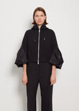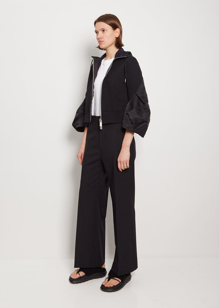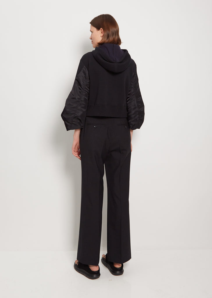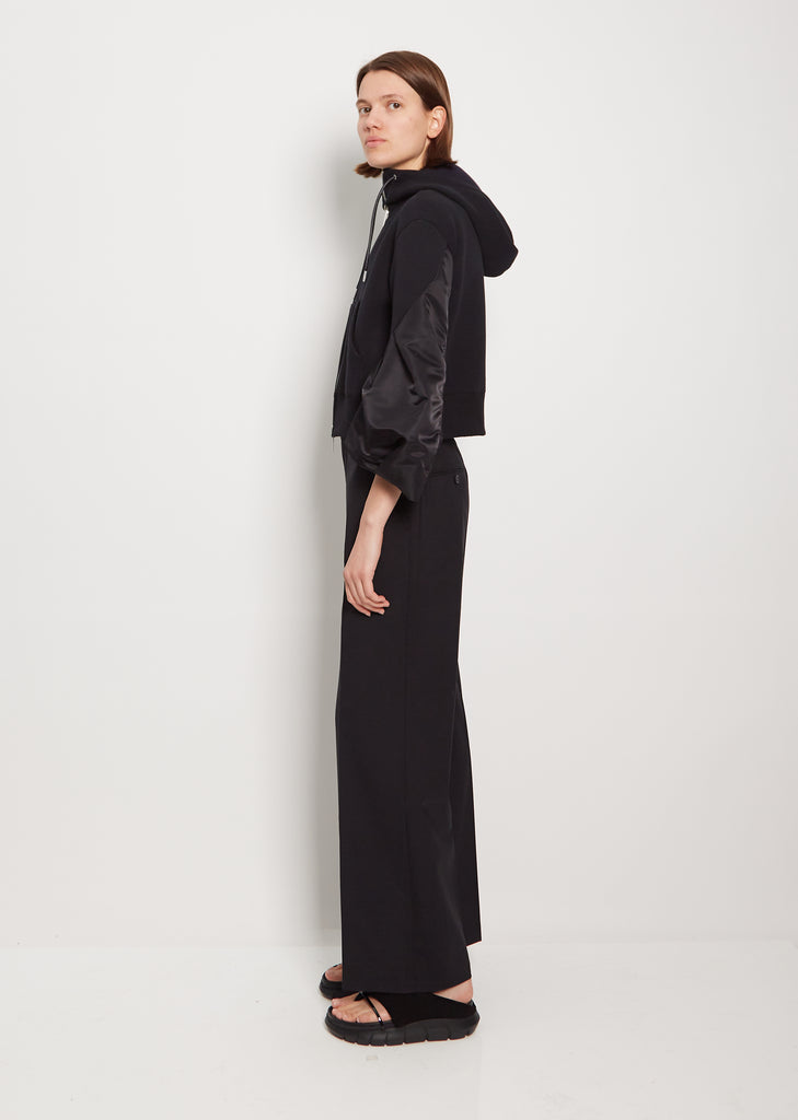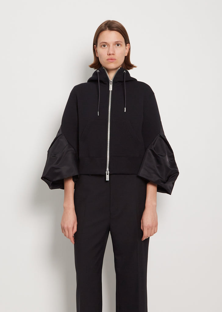 Sacai black zip-up cropped hoodie jacket in signature sponge sweat jersey with tonal nylon 3/4-length sleeves. Features front patch pockets and wide rib trim at hem. Detailed with black drawstring with metal tips to adjust hoodie. Silver-tone hardware throughout. Fully lined sleeves in orange Cupro fabric.