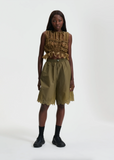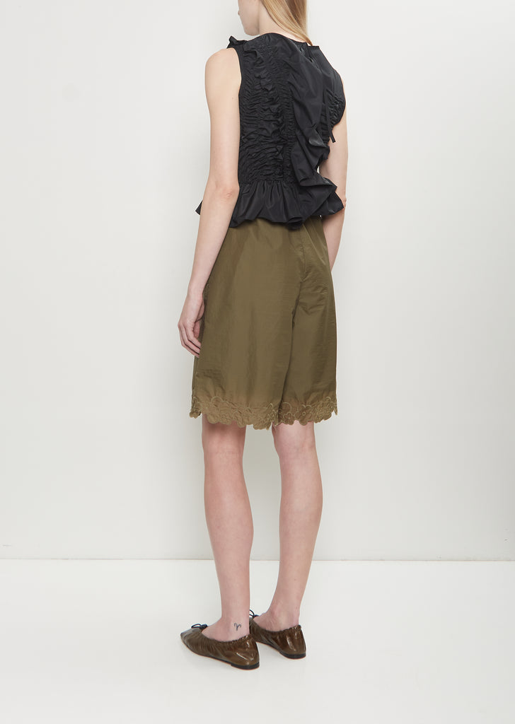 Cecilie Bahnsen olive oversized pull-on shorts with an elasticated waist and signature floral motif drawcord in polyamide ripstop technical fabric. Features gathering along waist, side seam pockets, and scalloped hem with signature embroidered floral motifs. Comes fully lined in self.