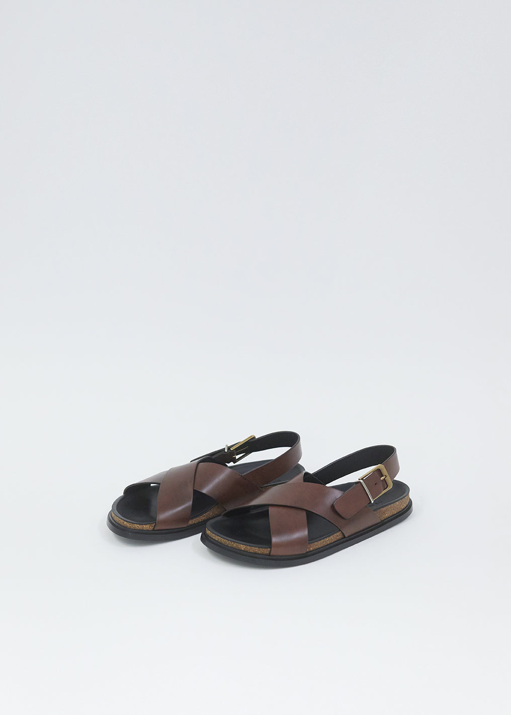 The Row burgundy sandal with two front straps and adjustable ankle strap fastening in soft and structured calfskin leather. Features a round toe, a gold-toned buckle, a lightweight cork contoured footbed and a durable rubber sole.
