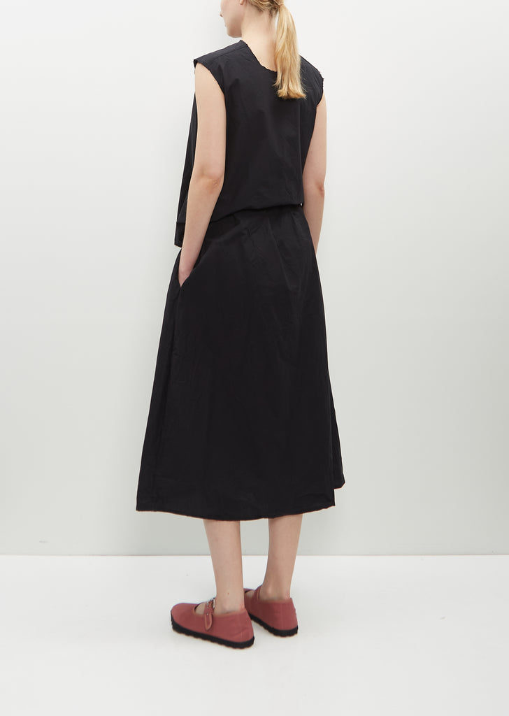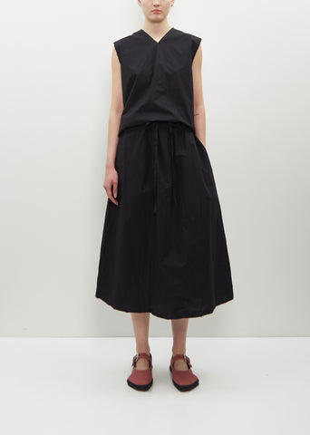 Scha black A-line skirt with a self drawstring waist washed cotton poplin. Features a stitched raw edge trim finish at hem, and hidden side seam pockets.