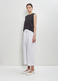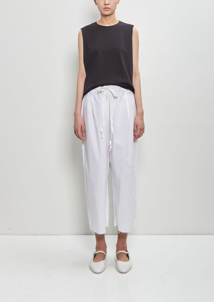 SCHA white cropped pull-on trousers with wide legs and an elasticated waist in washed paper cotton. Features an ivory adjustable grosgrain ribbon closure and stitched raw edge trim finishings at waist and hem.