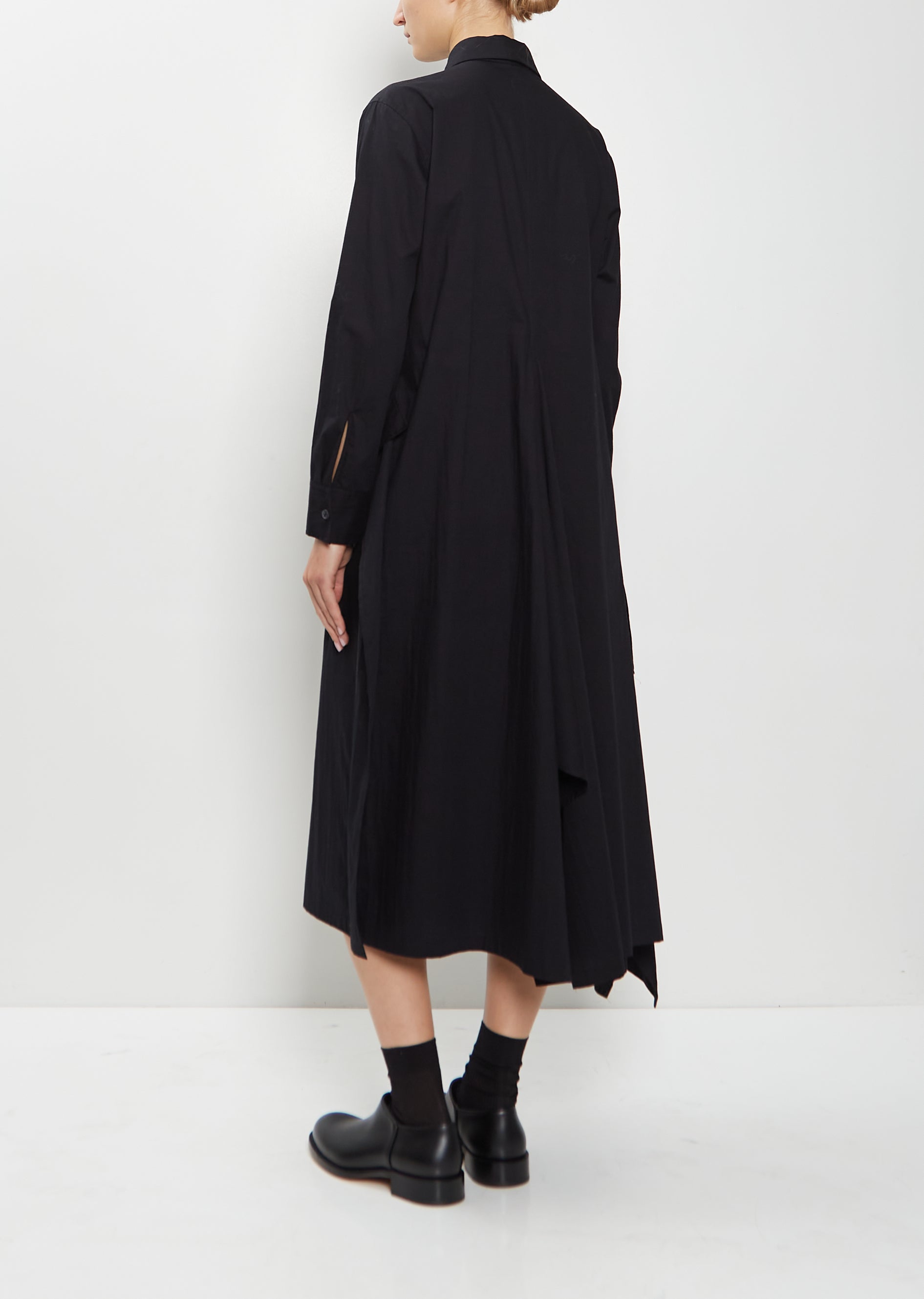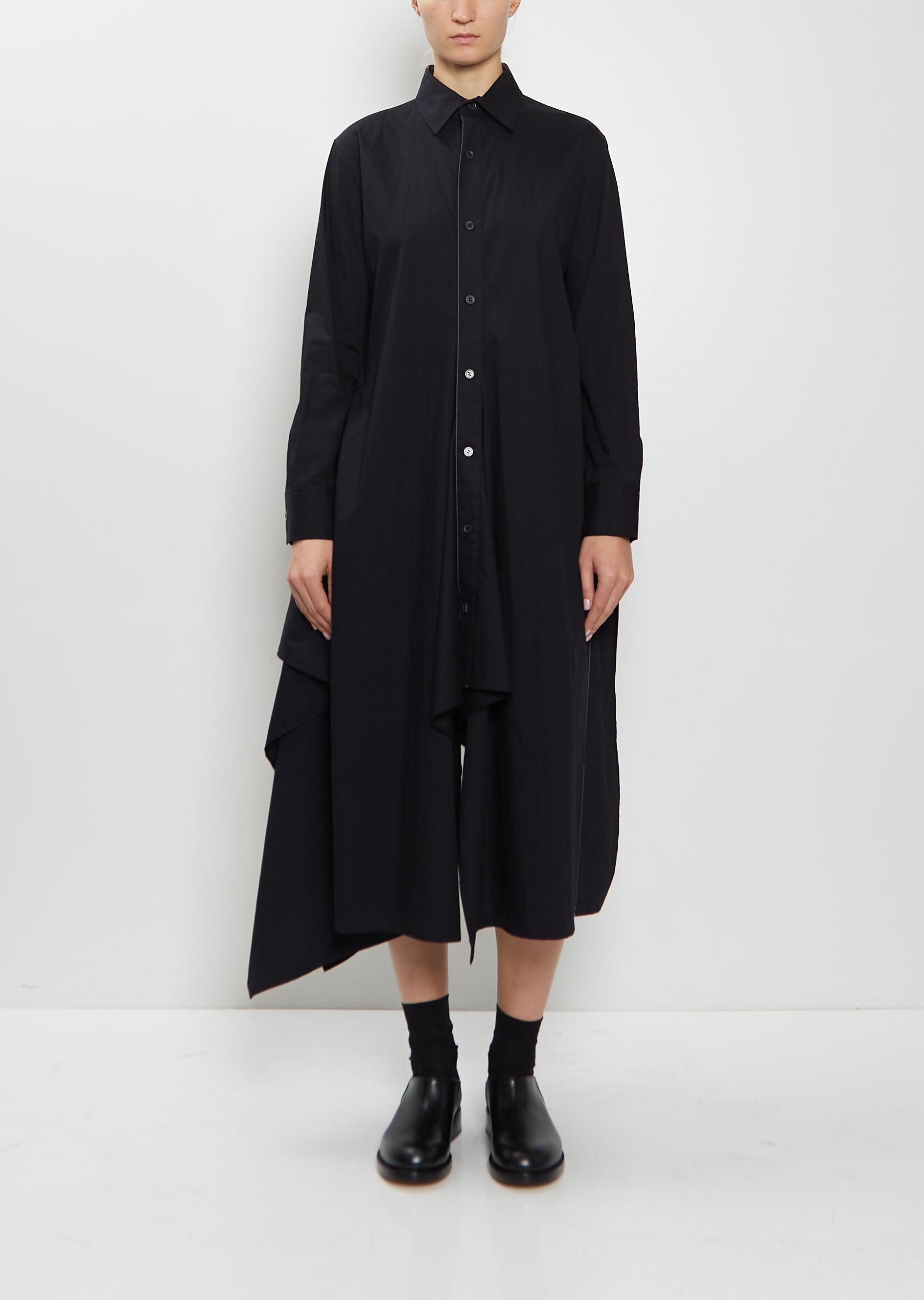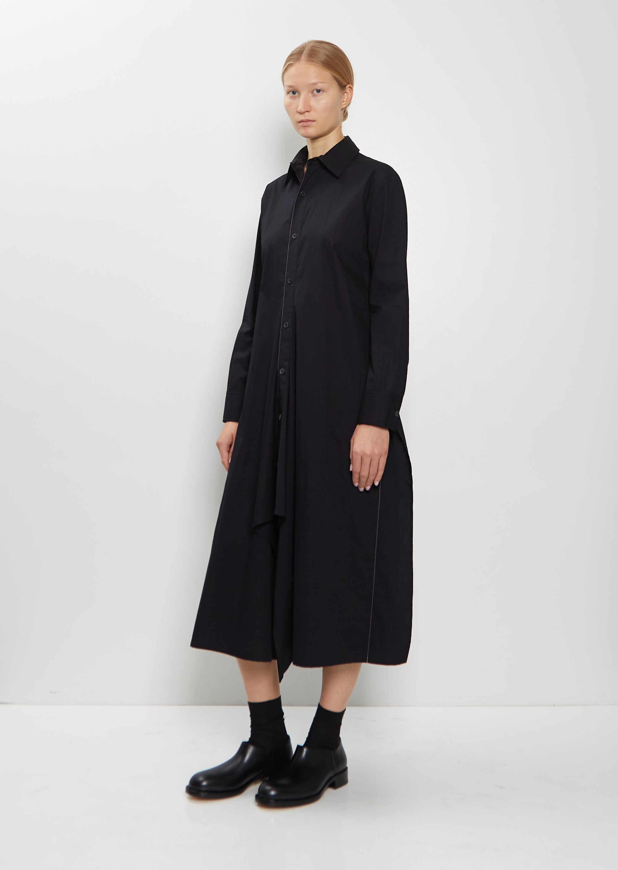Yohji Yamamoto black shirt dress with draped details at waist in cotton. Features a classic collar, set-in sleeves, buttoned cuffs, split side seam at right waist, and tonal button front. Finished with contrast white stitching at placket and left side seam.