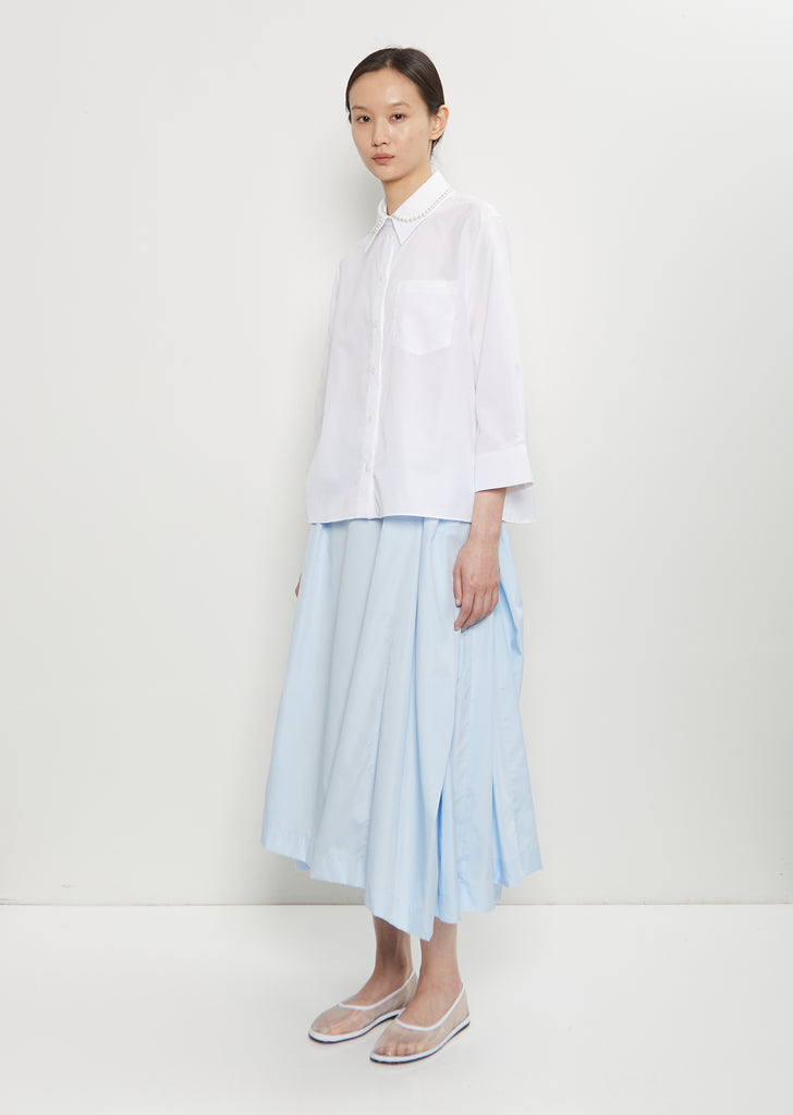 Simone Rocha white cropped button down shirt with a faux pearl embellished collar in cotton poplin. Features a classic collar, a single front patch pocket and shell-hued buttons closure at front.