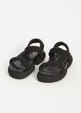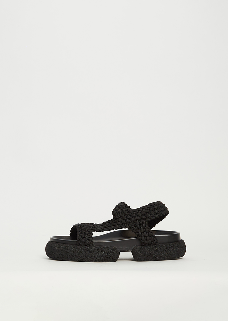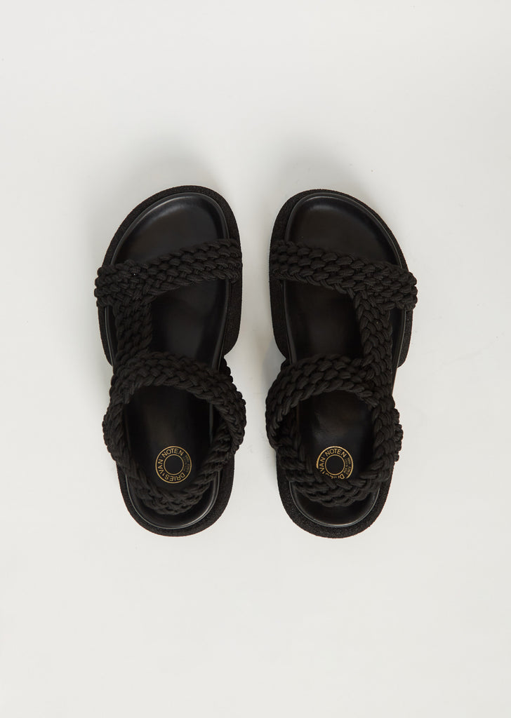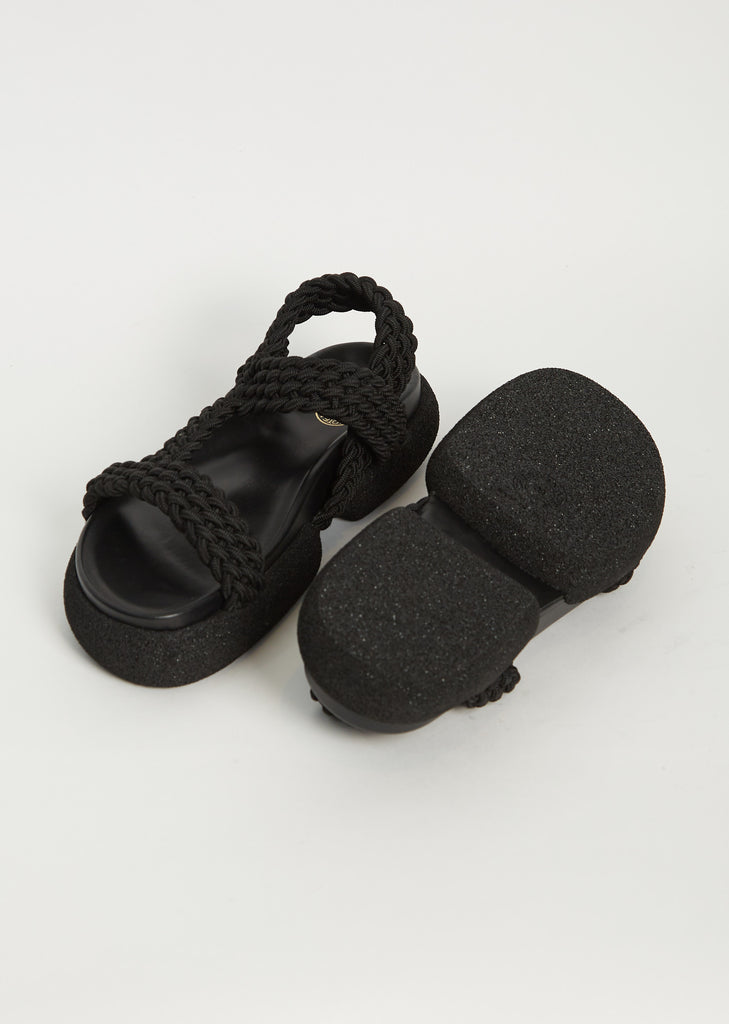 Dries Van Noten black platform sandal with braided rope straps in nylon. Fully lined in tonal black leather and set on a tonal rubber stacked sole.