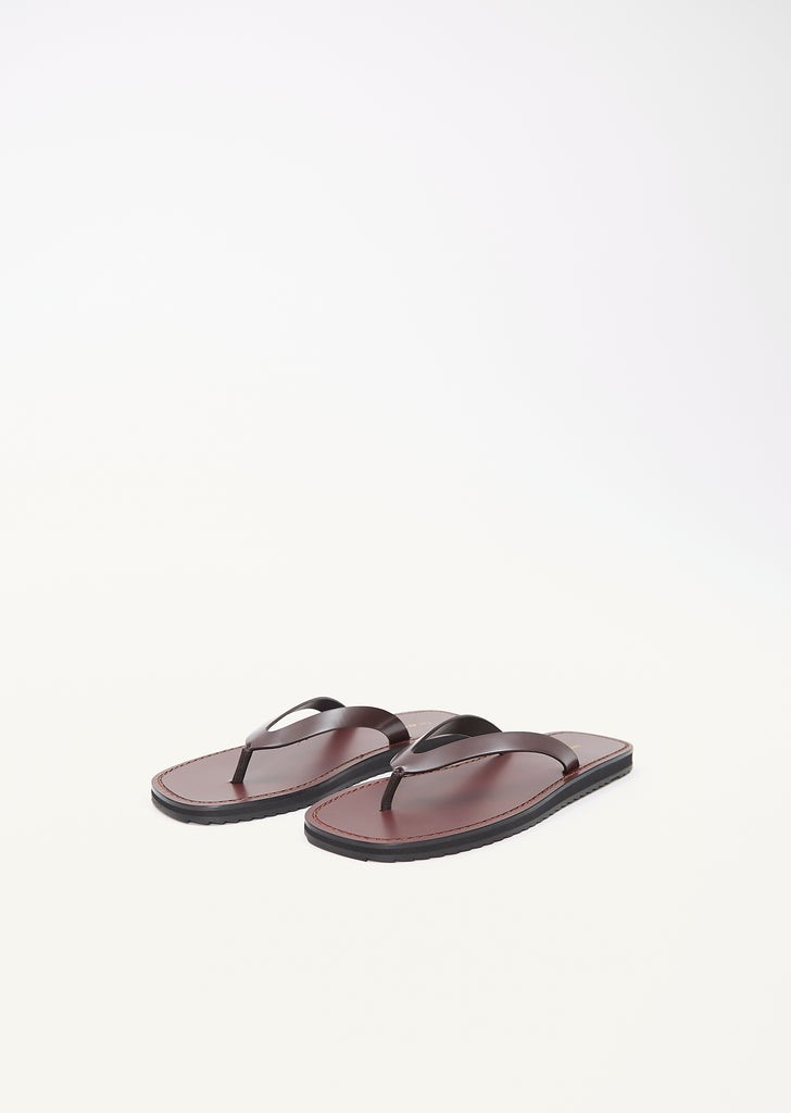 The Row bordeaux flip flop sandal with stitched leather detailing and a lightly treaded sole in shiny leather.