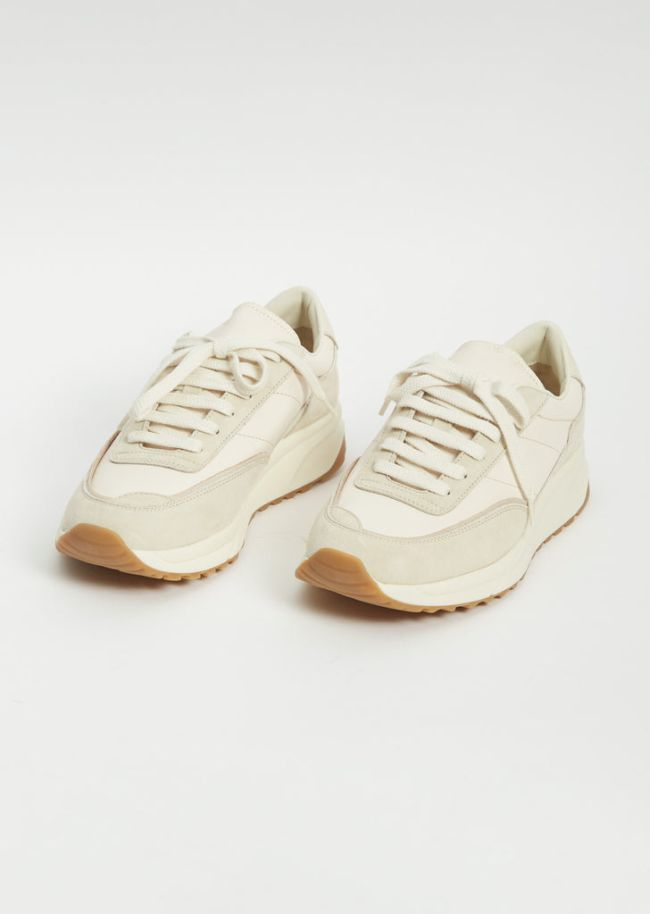 Common Projects retro runner lace-up, low top sneakers with off-white suede and leather paneling. Fully lined in off-white leather with an off-white rubber outsole and contrast tan treaded sole. Lightly padded collar and tongue. Signature gold stamped style numbers on side heel. 6-eyelet lace-up construction with tonal laces.