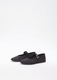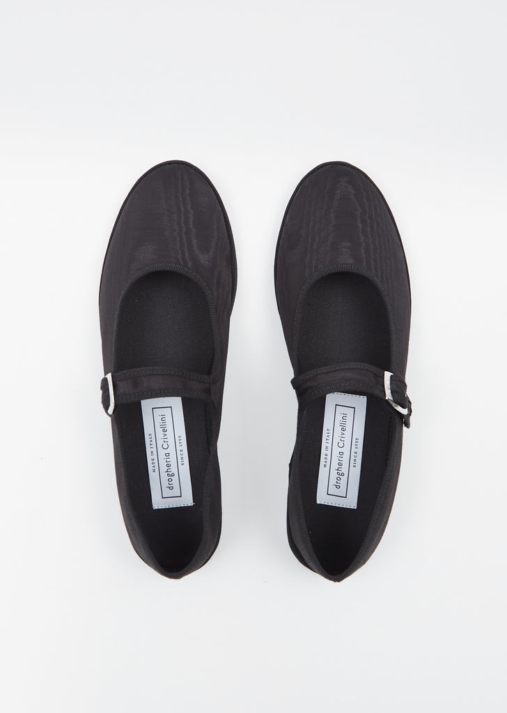 Drogheria Crivellini black mary jane with a faux polished silver buckle and snap fastened strap closure in moire. Features a sustainably constructed rubber sole made from recycled bicycle tires with contrasting white stitching. Finished with tonal grosgrain trims.