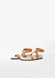 Totême tan straps sandal with contrast topstitching in grained leather. Features a round open toe, a molded insole in linen-blend canvas, a stacked leather midsole and a crossover ankle strap with gold-tone stud fastening. Finished with a rubber sole.