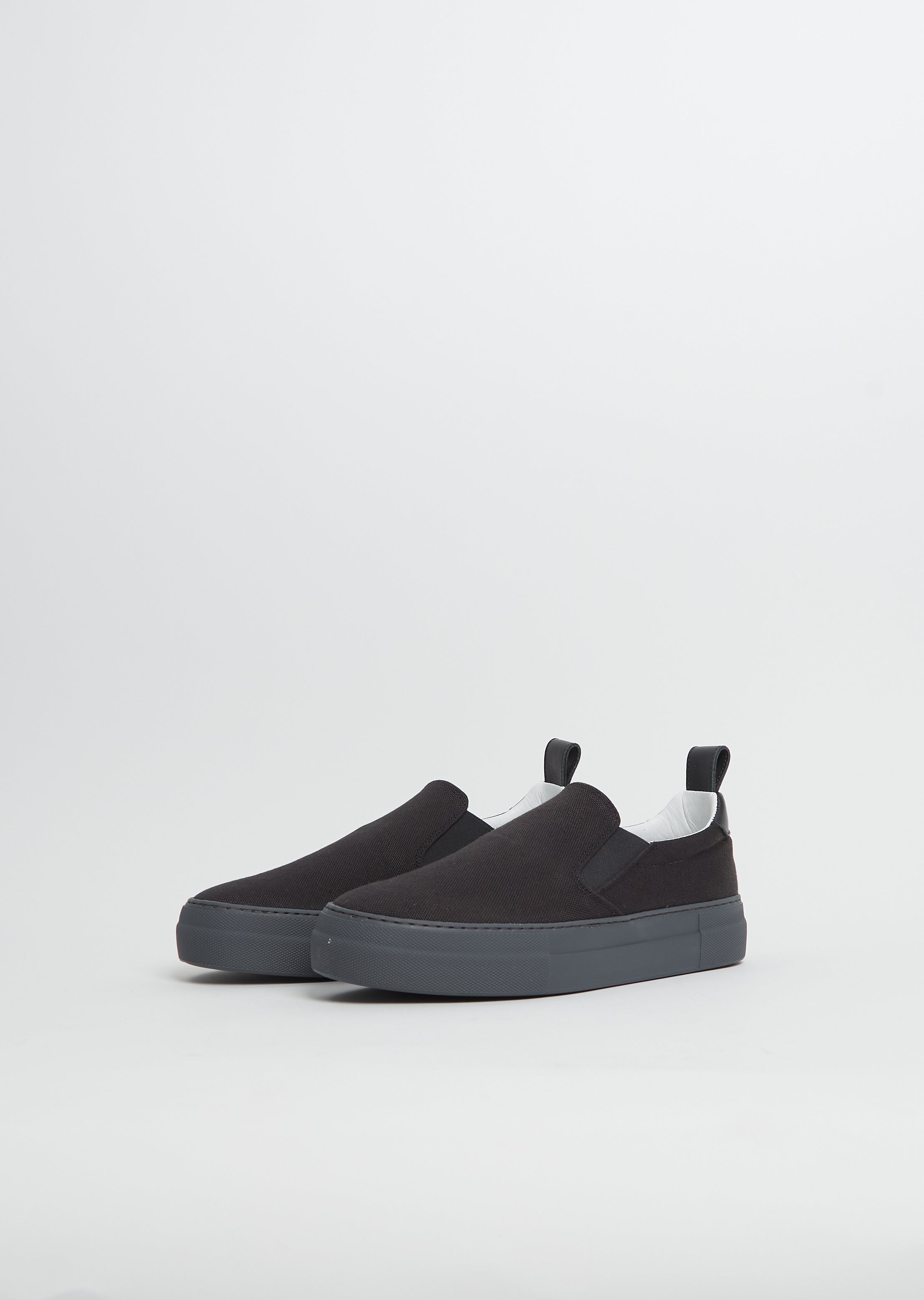 Sofie D'Hoore black slip-on sneaker with a round toe and elastic side panels in a cotton blend canvas. Features a pull tab at back and chunky rubber sole. Lined in soft and smooth leather.