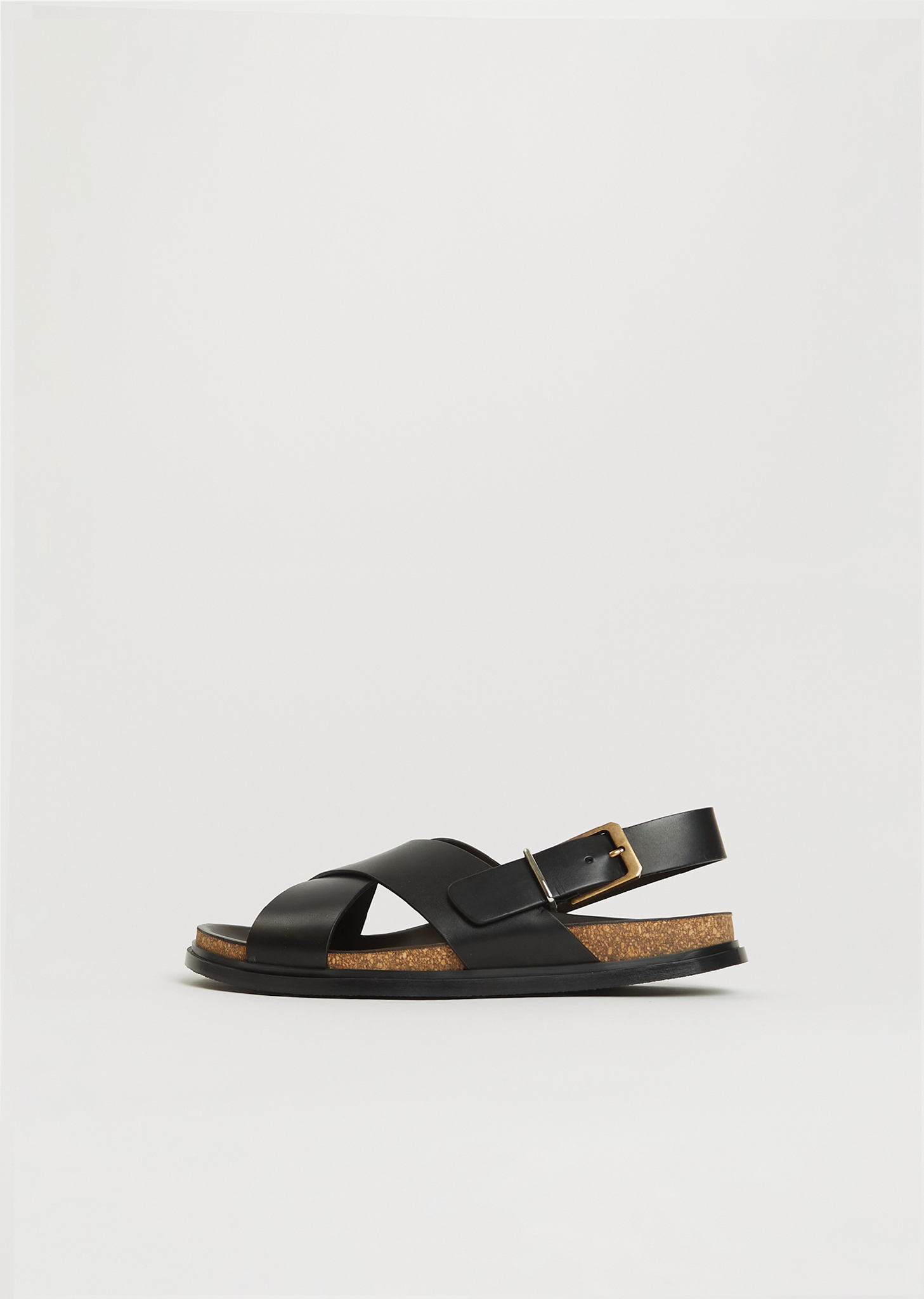 The Row black sandal with two front straps and adjustable ankle strap fastening in soft and structured calfskin leather. Features a round toe, a gold-toned buckle, a lightweight cork contoured footbed and a durable rubber sole.