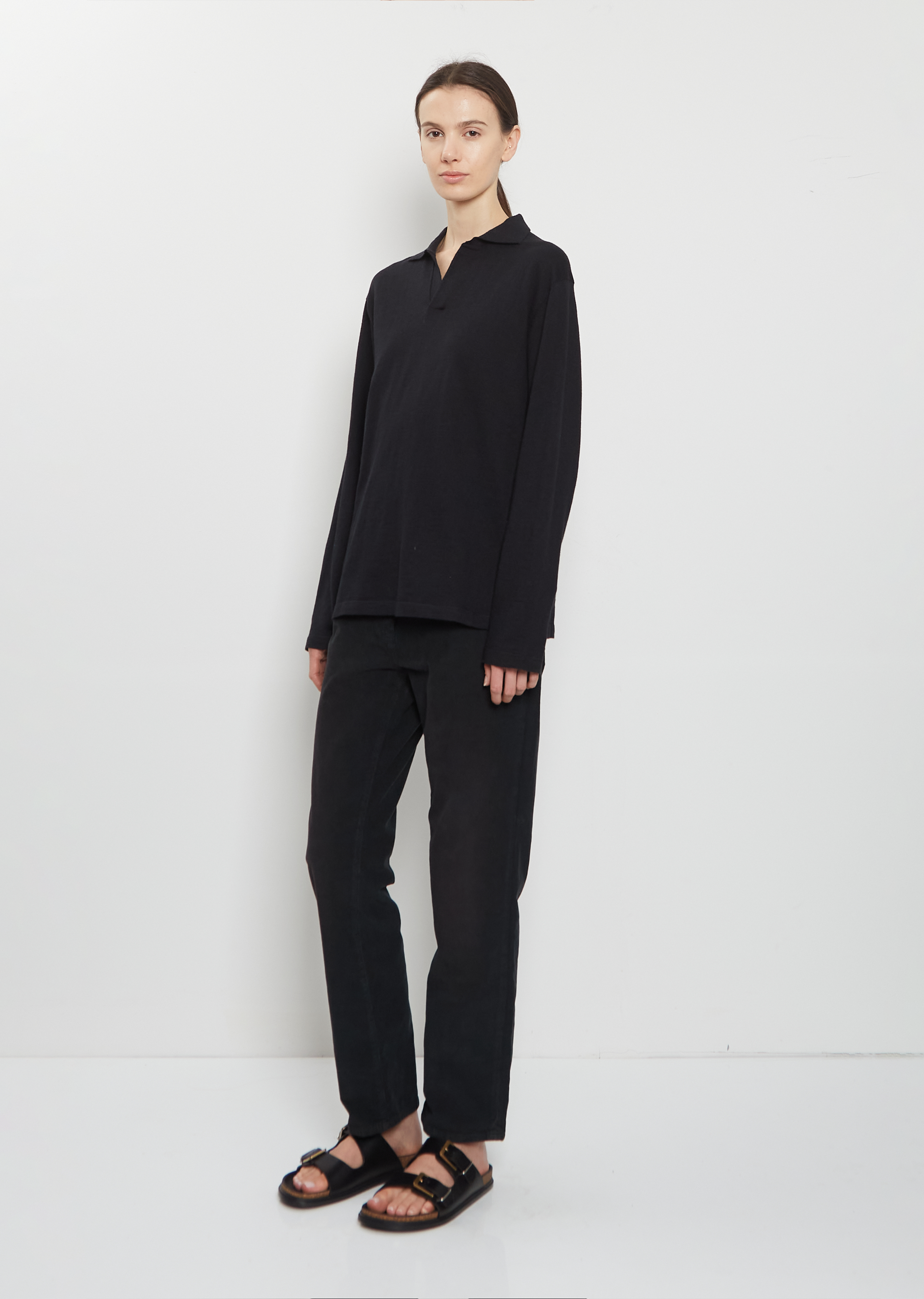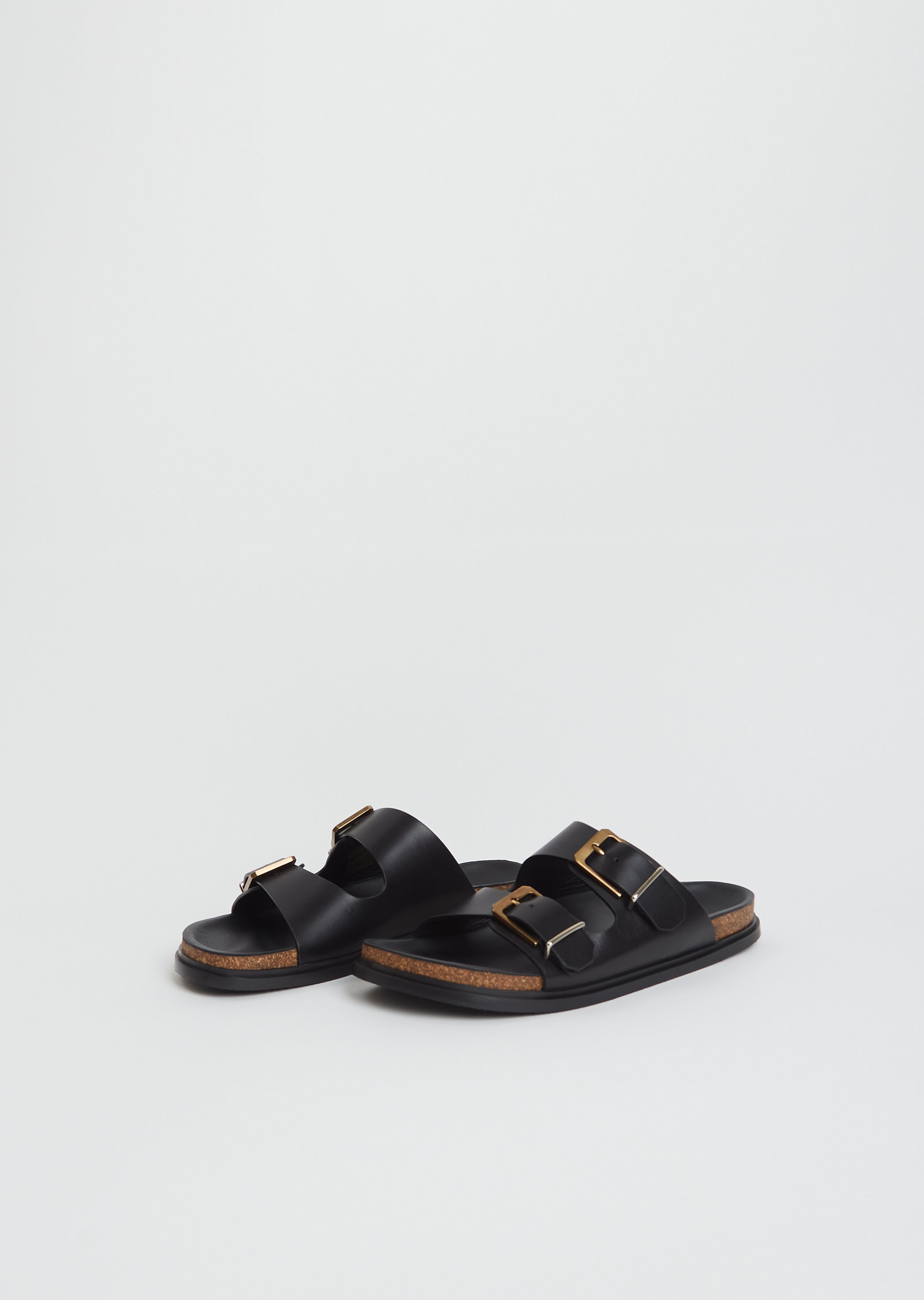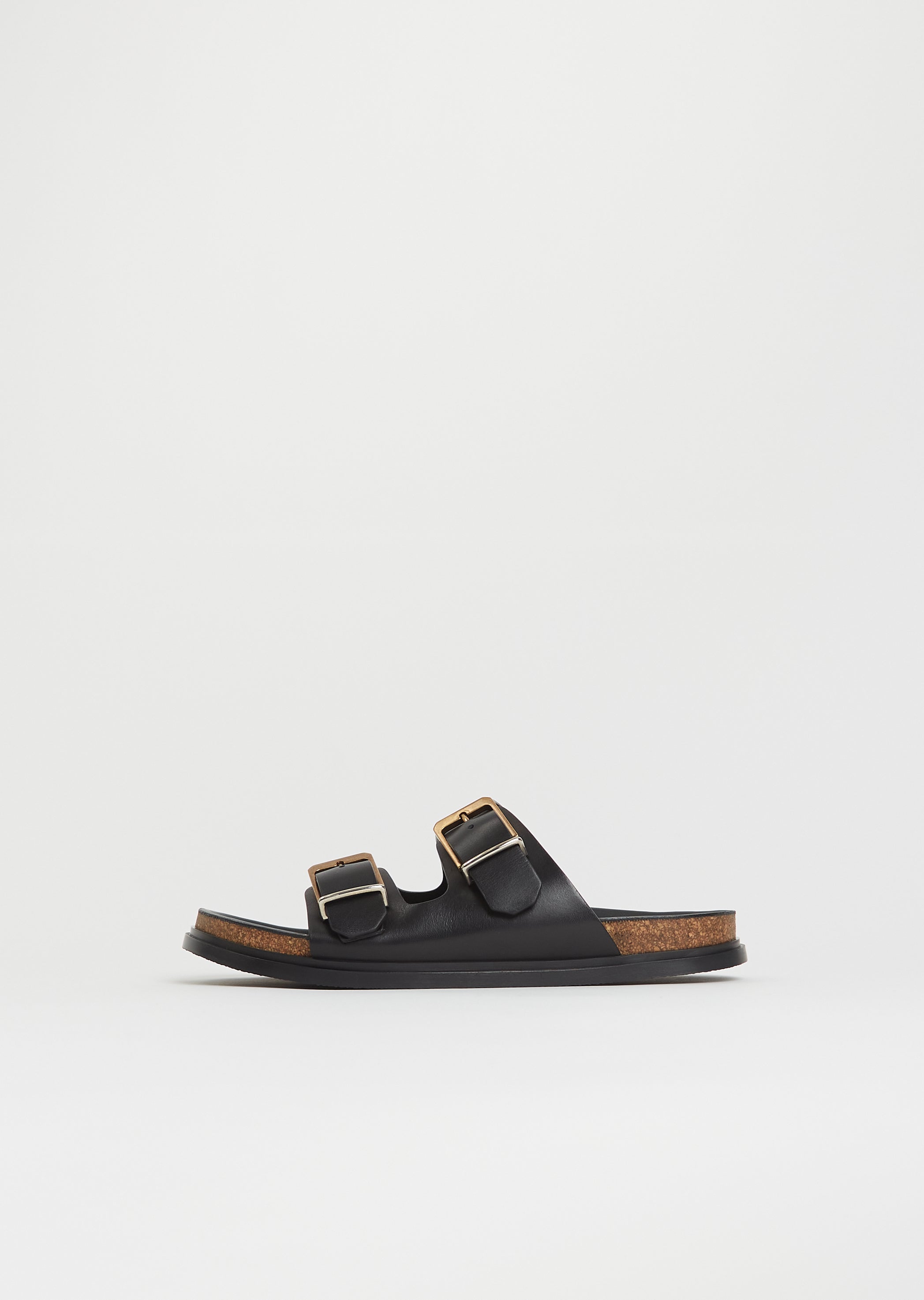 The Row black slip-on sandal with a adjustable straps and a lightweight cork contoured footbed in soft calfskin leather. Features a round toe, custom two-tone metal buckles and a durable rubber sole.