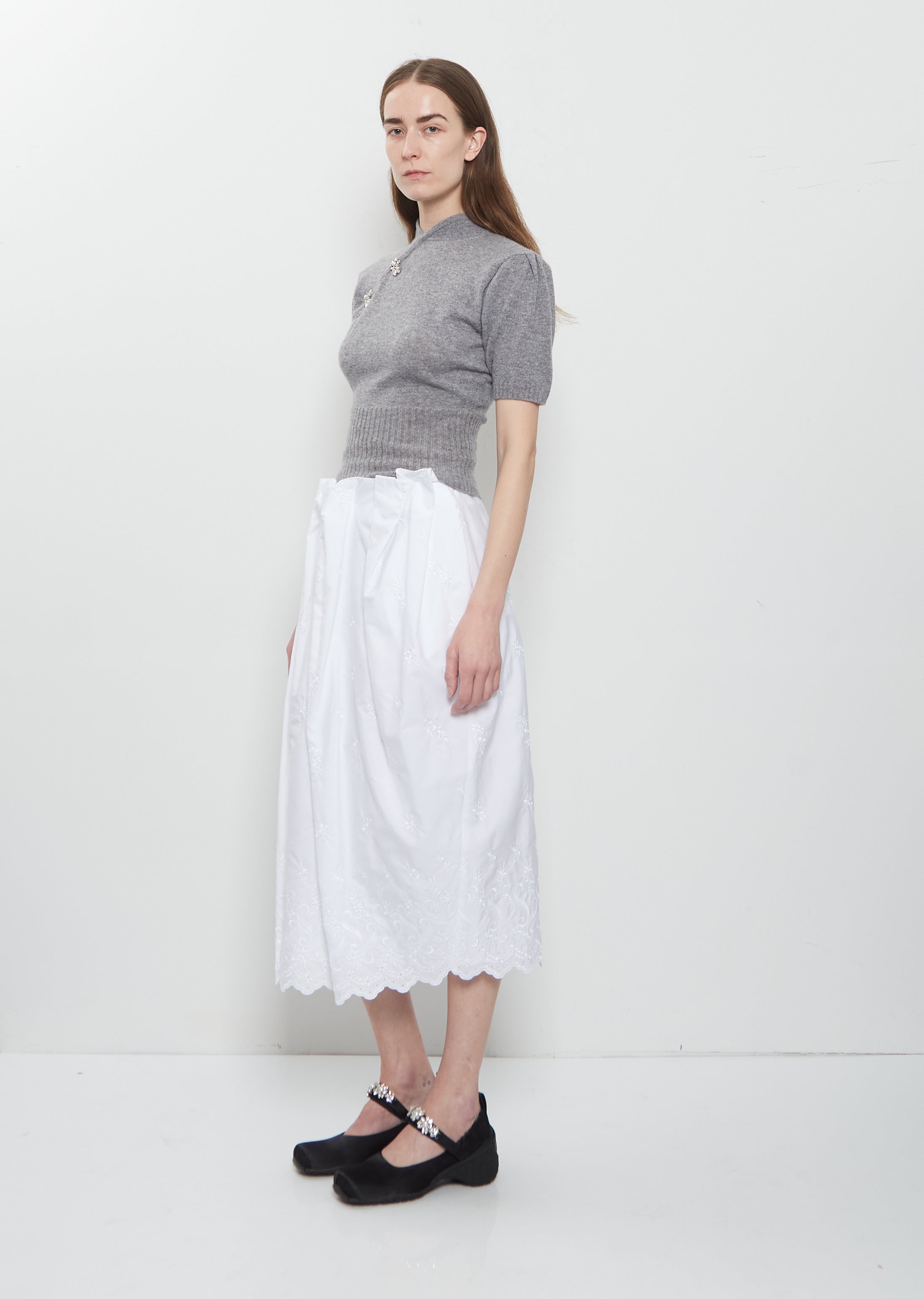 Simone Rocha white pencil skirt with a pleated waist to resemble flower petals in crisp cotton with eyelet lace details. Features a slit at back hem and a concealed zipper closure. Regular fit.
