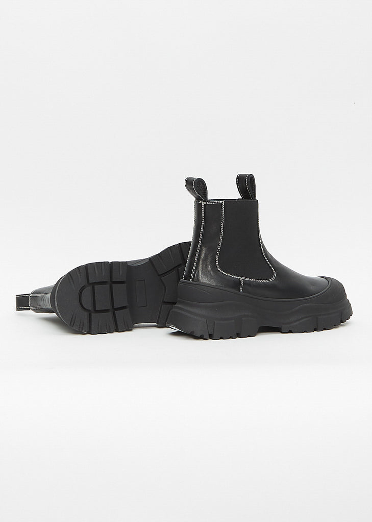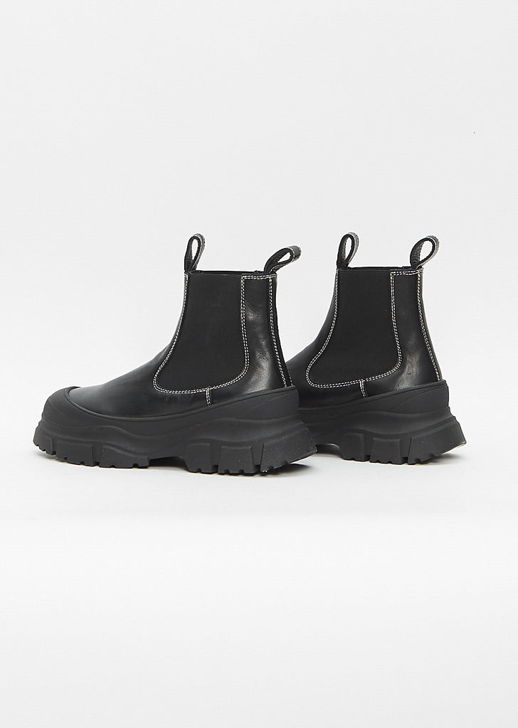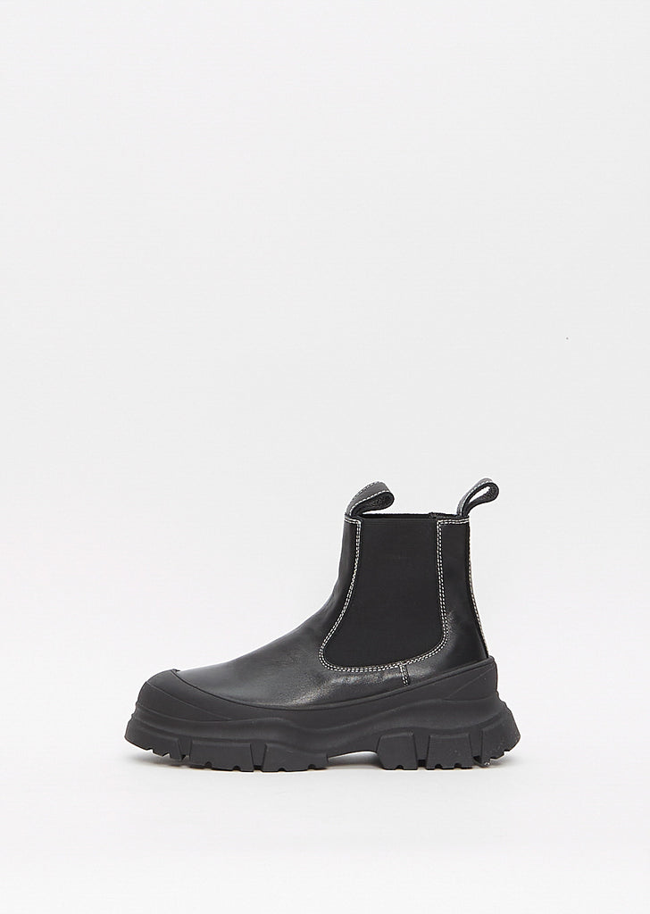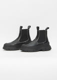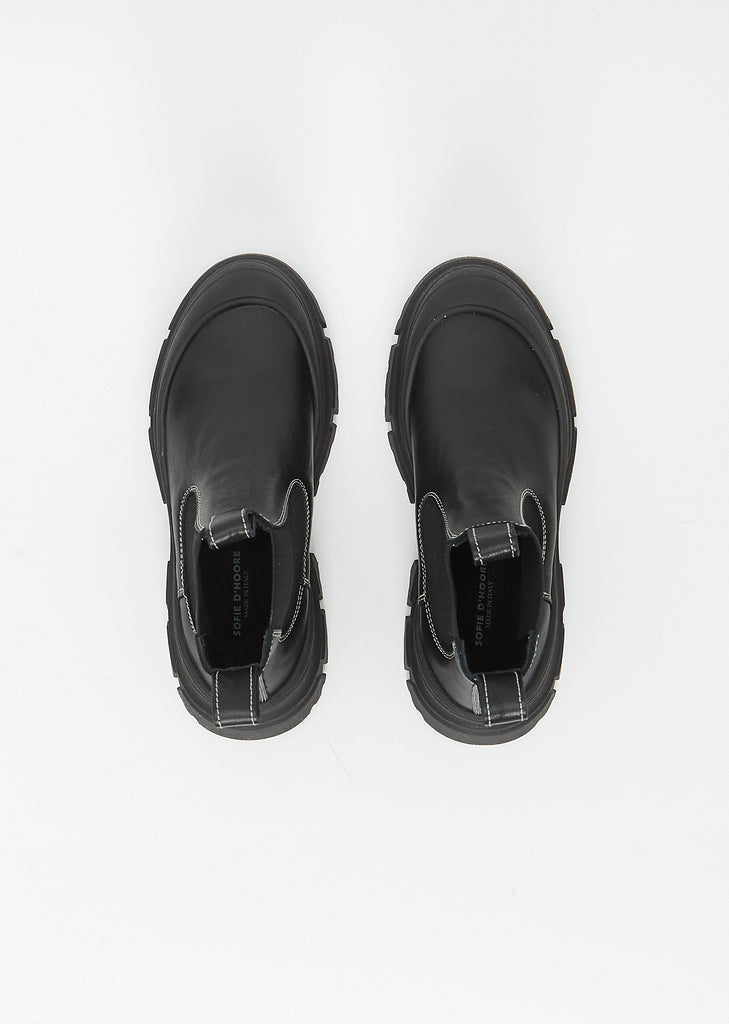 Sofie D'Hoore black chelsea boots with curved gussets and a round toe crafted in soft nappa leather. Fully lined in leather with a treaded rubber sole. Finished with topstitching and two leather loop pulls.