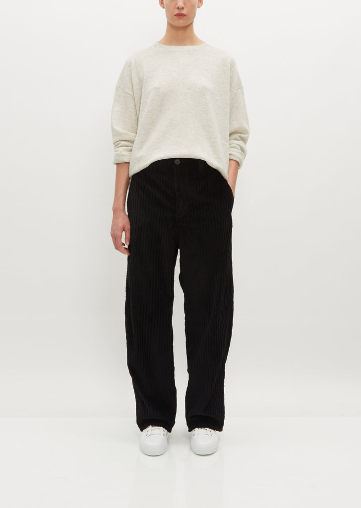 Sofie D'Hoore black straight leg pant in large ribbed cotton corduroy. Features a clean front, belt loops, welt side pockets, and patch pockets at back. Zipper fly with hook & bar fastening. Relaxed fit.
