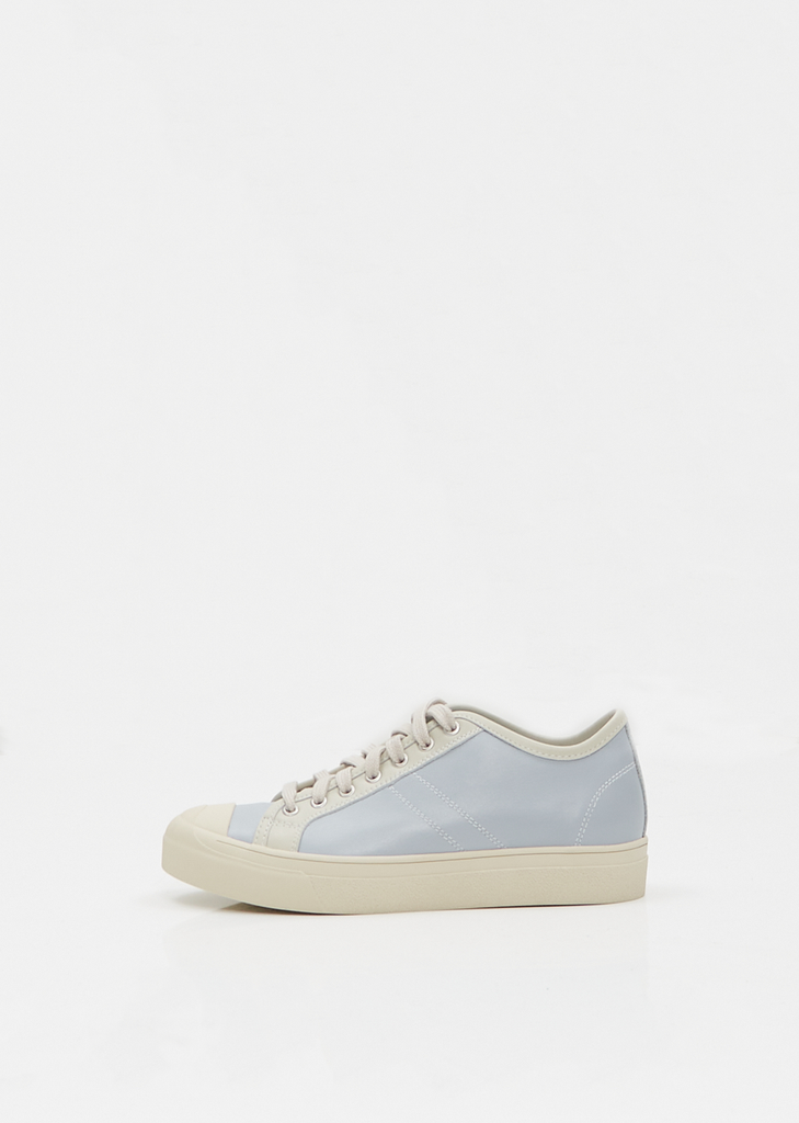 Sofie D'hoore Falco low-top two-tone leather sneakers with waterfall blue upper and light beige rubber toecap and sole in smooth leather. Comes with tonal light beige cotton lacing. Detailed with light beige stitching detail at sides and at back heel. Fully lined in leather with an elevated cushioned in-sole.