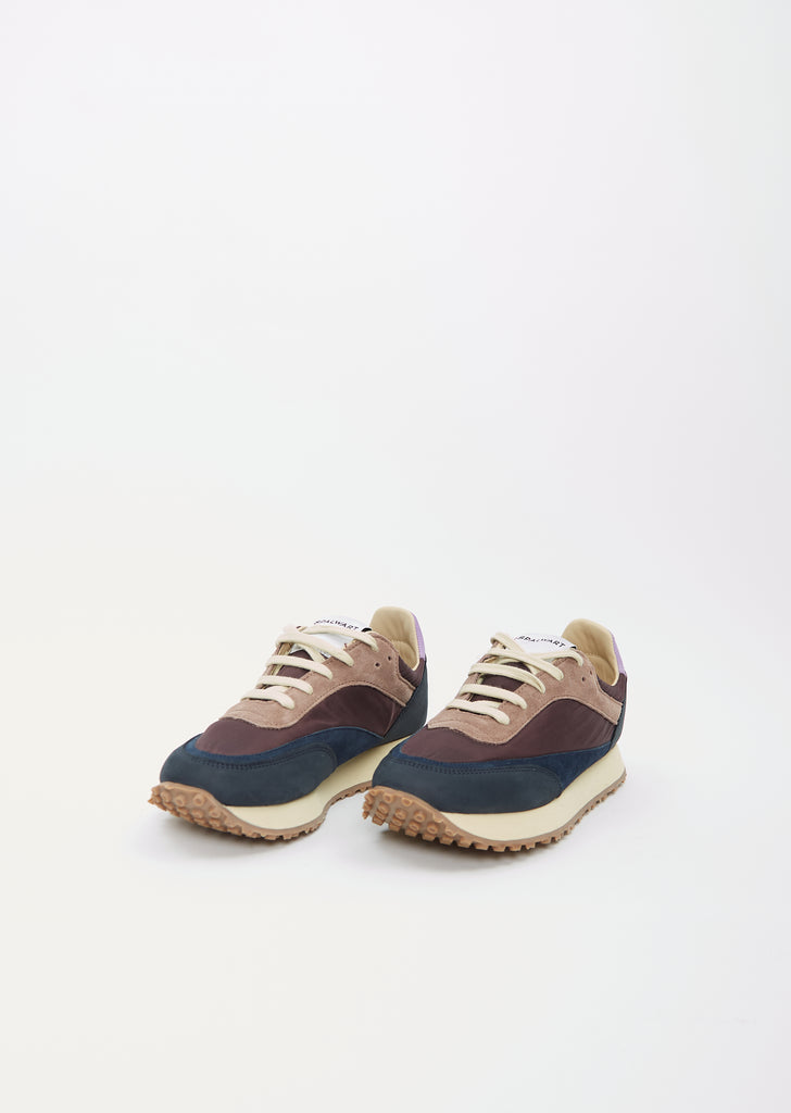 Spalwart blue and burgundy lace-up low-top sneakers in suede, nappa leather and airbag fabric. Features a round toe, rubber sole and woven brand tag at tongue. Lined with a beige calfskin leather.