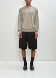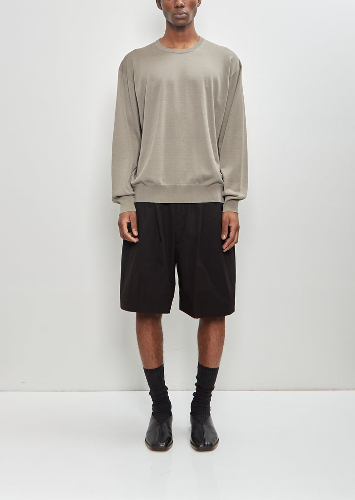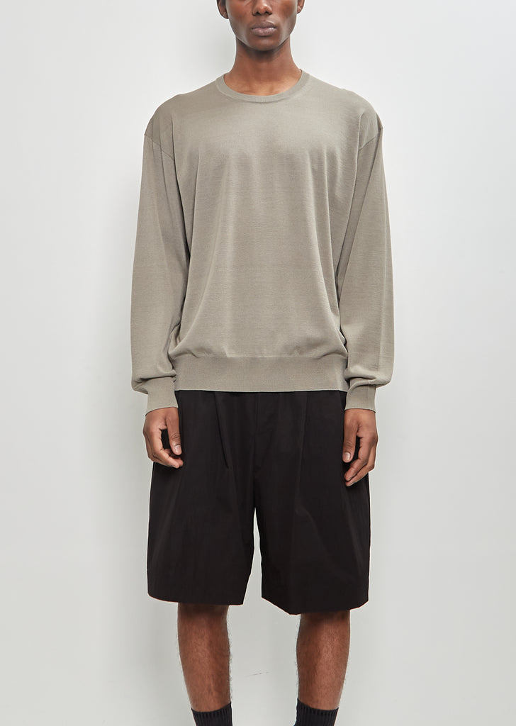 Stein greige long sleeve pullover sweater with round neckline in mid-weight wool and silk blend knit. Features dropped shoulders and ribbed trim finish at neckline, cuffs, and hem. Relaxed fit.
