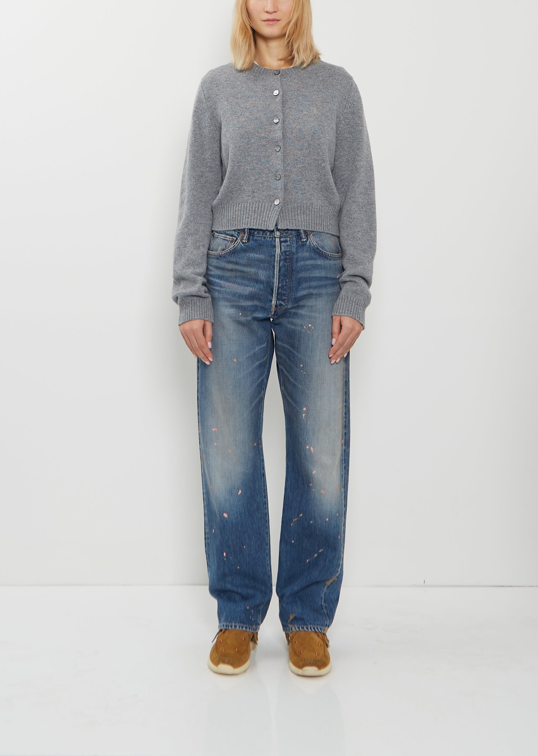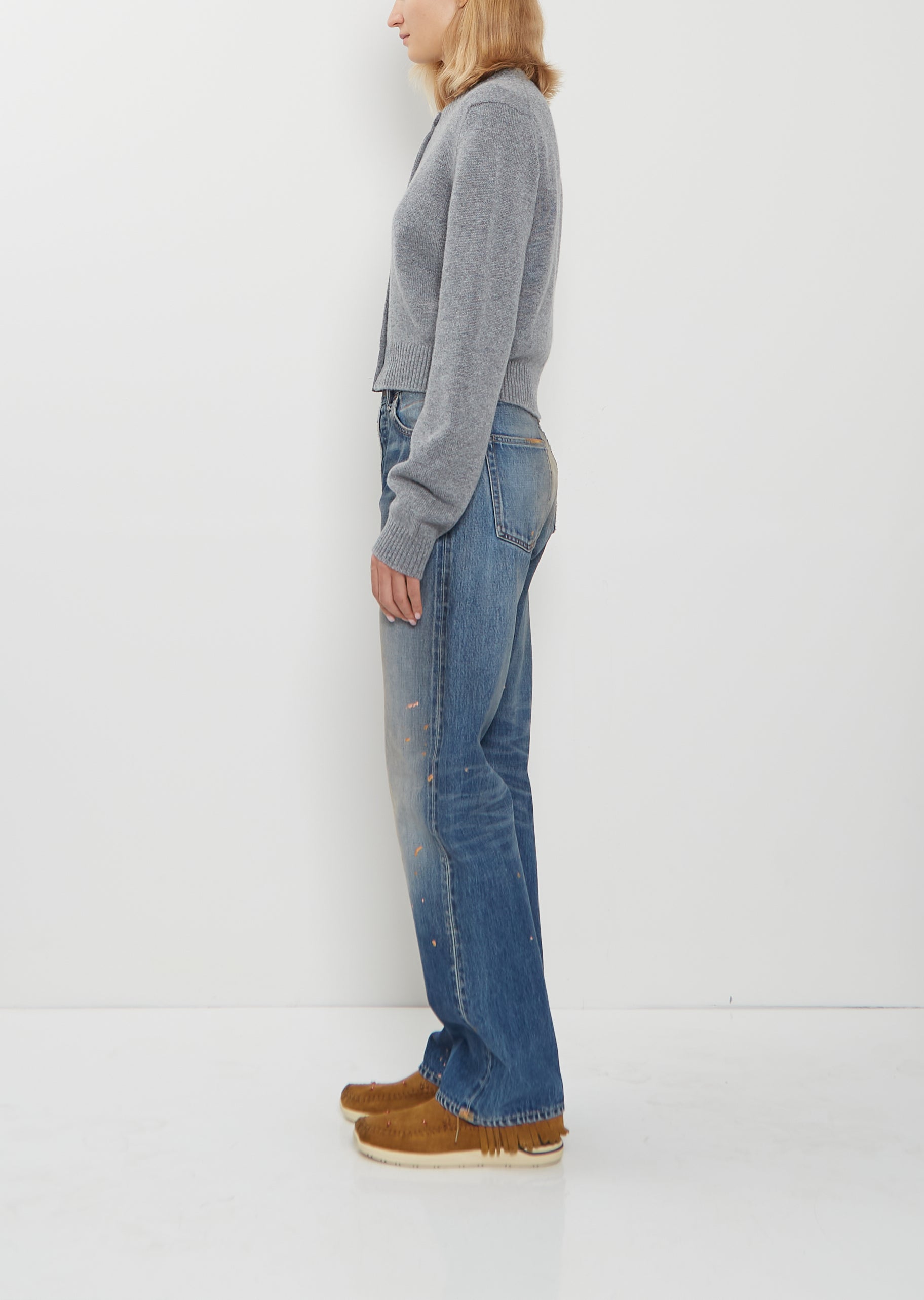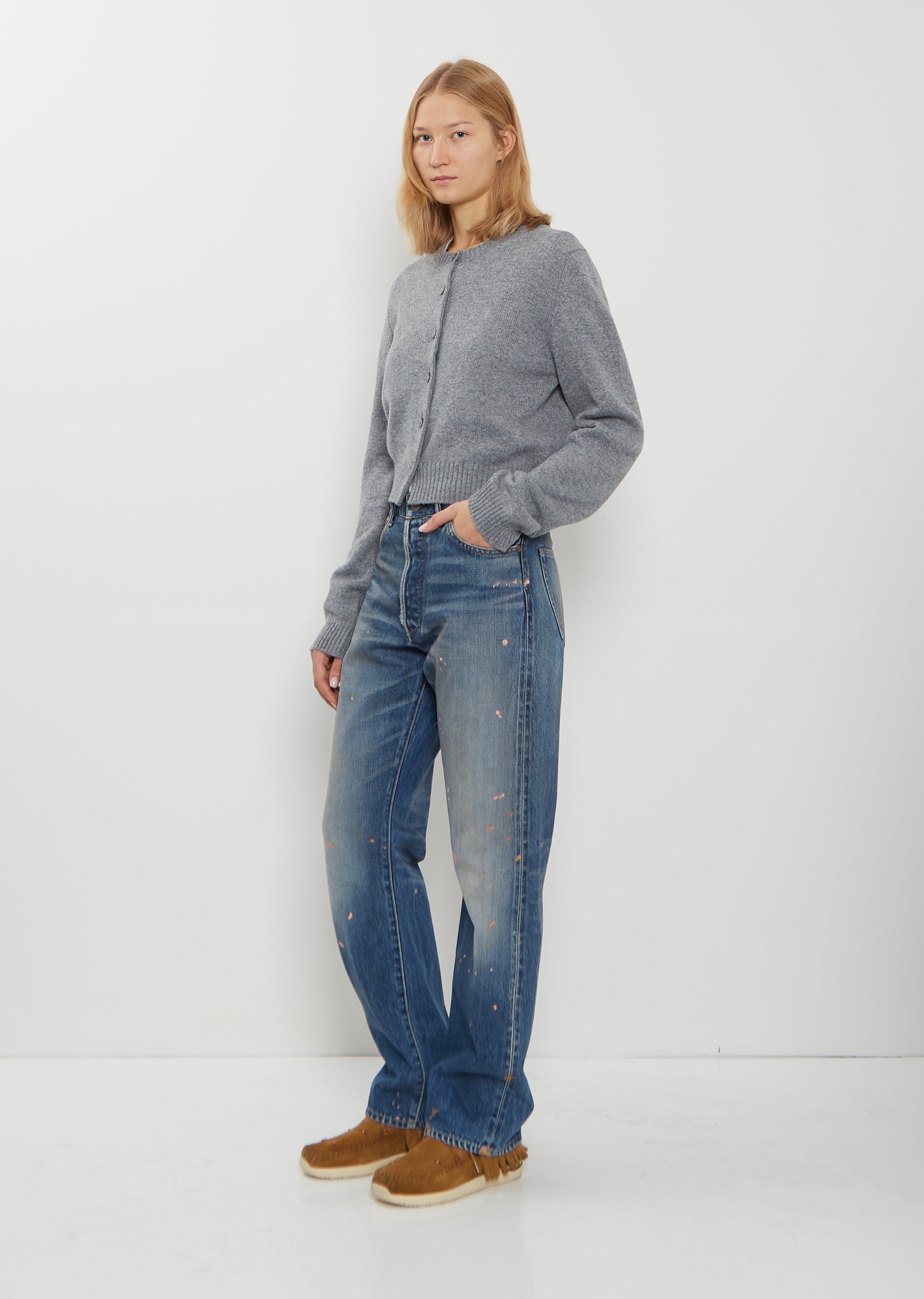 Visvim indigo jeans with straight legs and light pink paint details splattered throughout in Japanese selvedge denim with a faded and worn effect. Features belt loops, 5-pocket construction, a hidden zippered compartment inside back right patch pocket, branded leather patch at back waist, and a copper-toned button-fly.