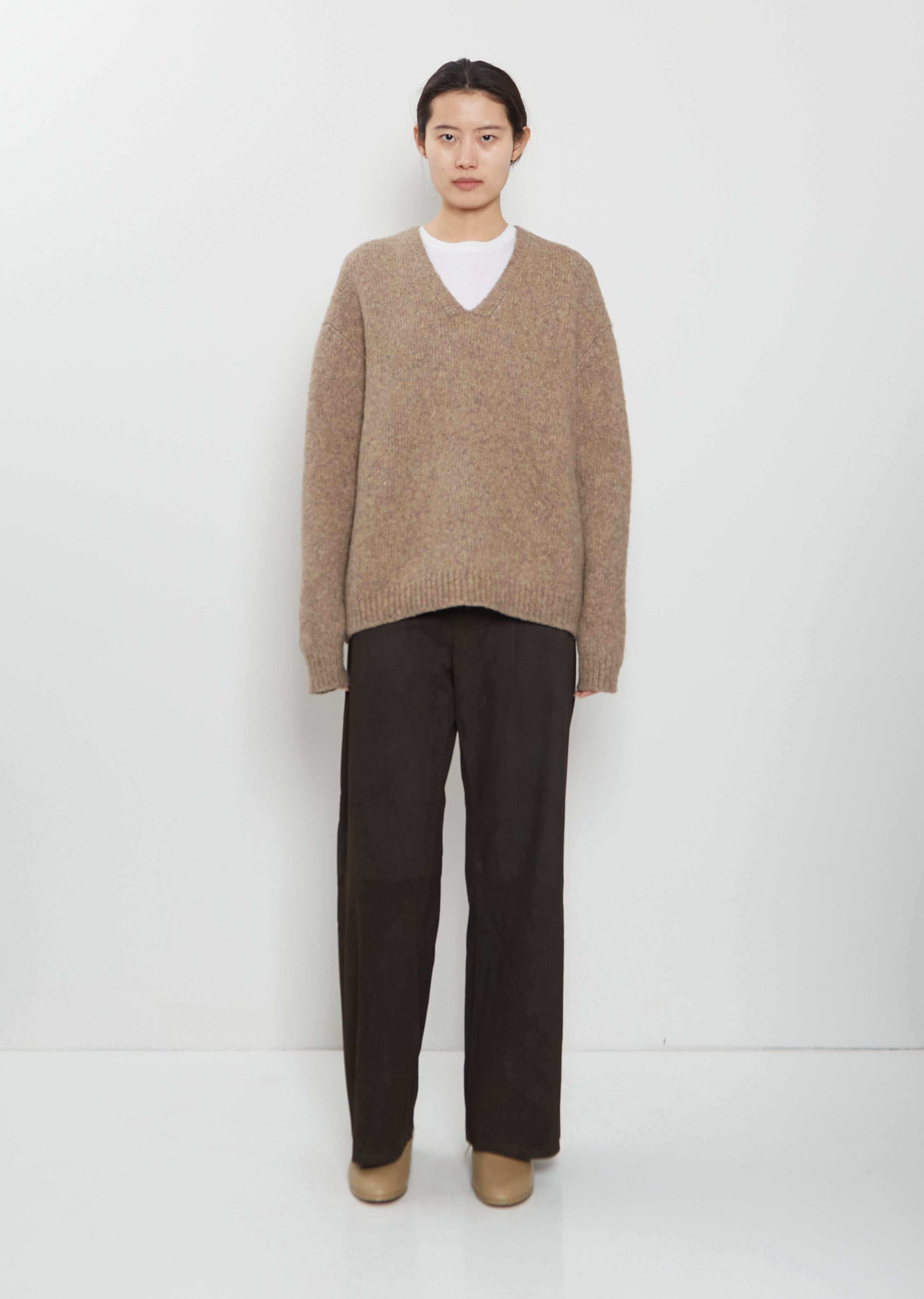Lauren Manoogian light brown V-neck sweater with dropped shoulders in soft mid-weight alpaca, merino wool and cotton blend knit. Features rib trim finishings at neckline, cuffs and hem. relaxed fit.