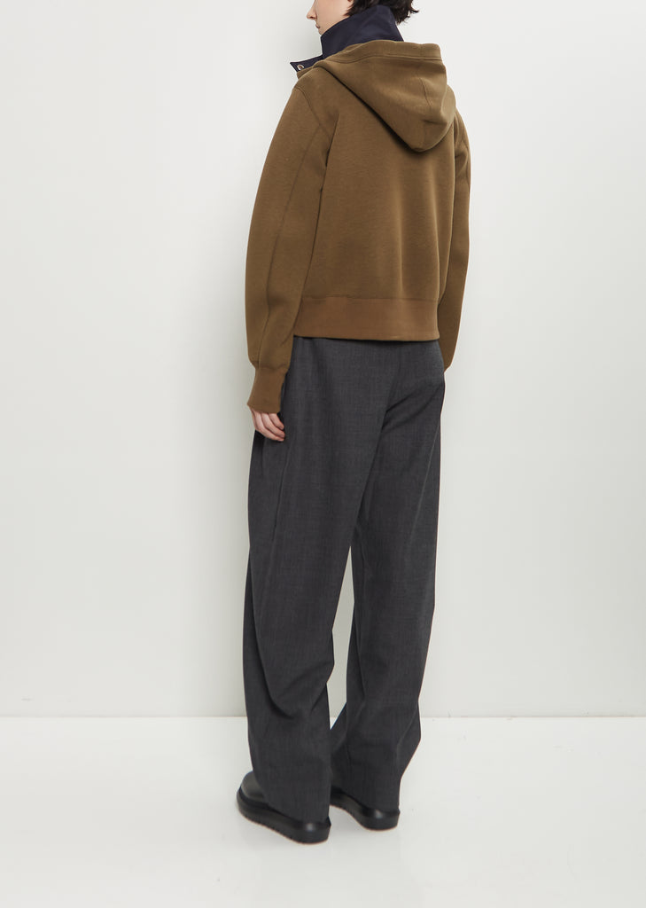 Sacai dark beige hoodie with a navy center panel and stand collar in a cotton blend. Features a double zip closure, press button socket details along front navy panel, two press button studs at neck, angled front pockets, and ribbed trim finish at cuffs and hem.