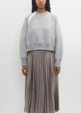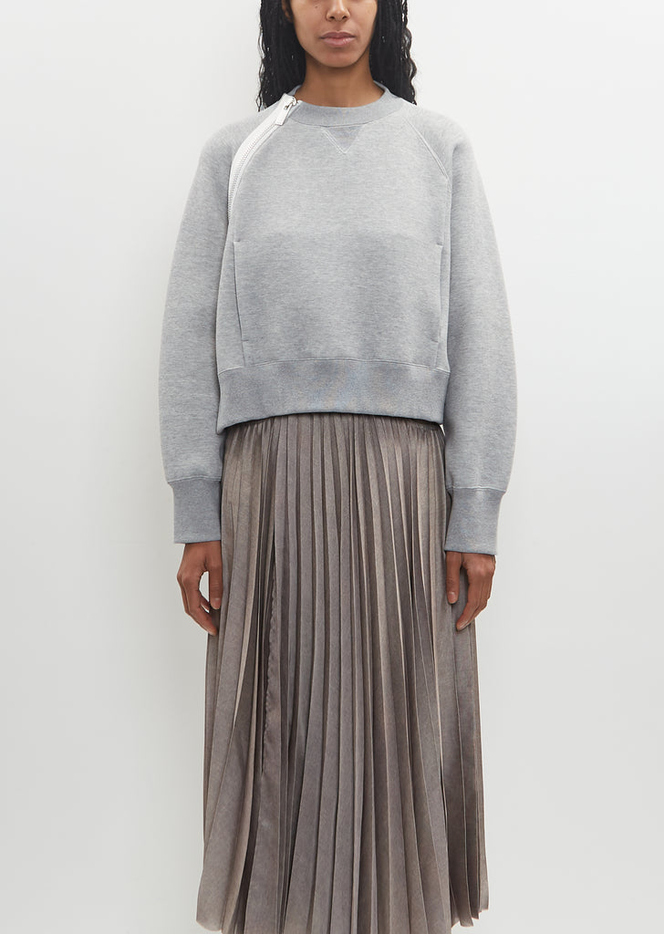 Sacai light grey pullover cropped sweatshirt with oversized zipper detail at shoulder in cotton blend signature sponge jersey. Features a round neck, raglan sleeves, slit at left hem, seam pockets at waist and rib trim finishings at neck, cuffs and hem.