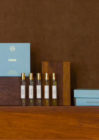 The Icons Collection, a set of our five classic eaux de parfum (9 ml); Bergamot, Rain Cloud, Leather, Ink and Smoke.