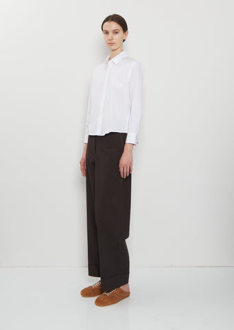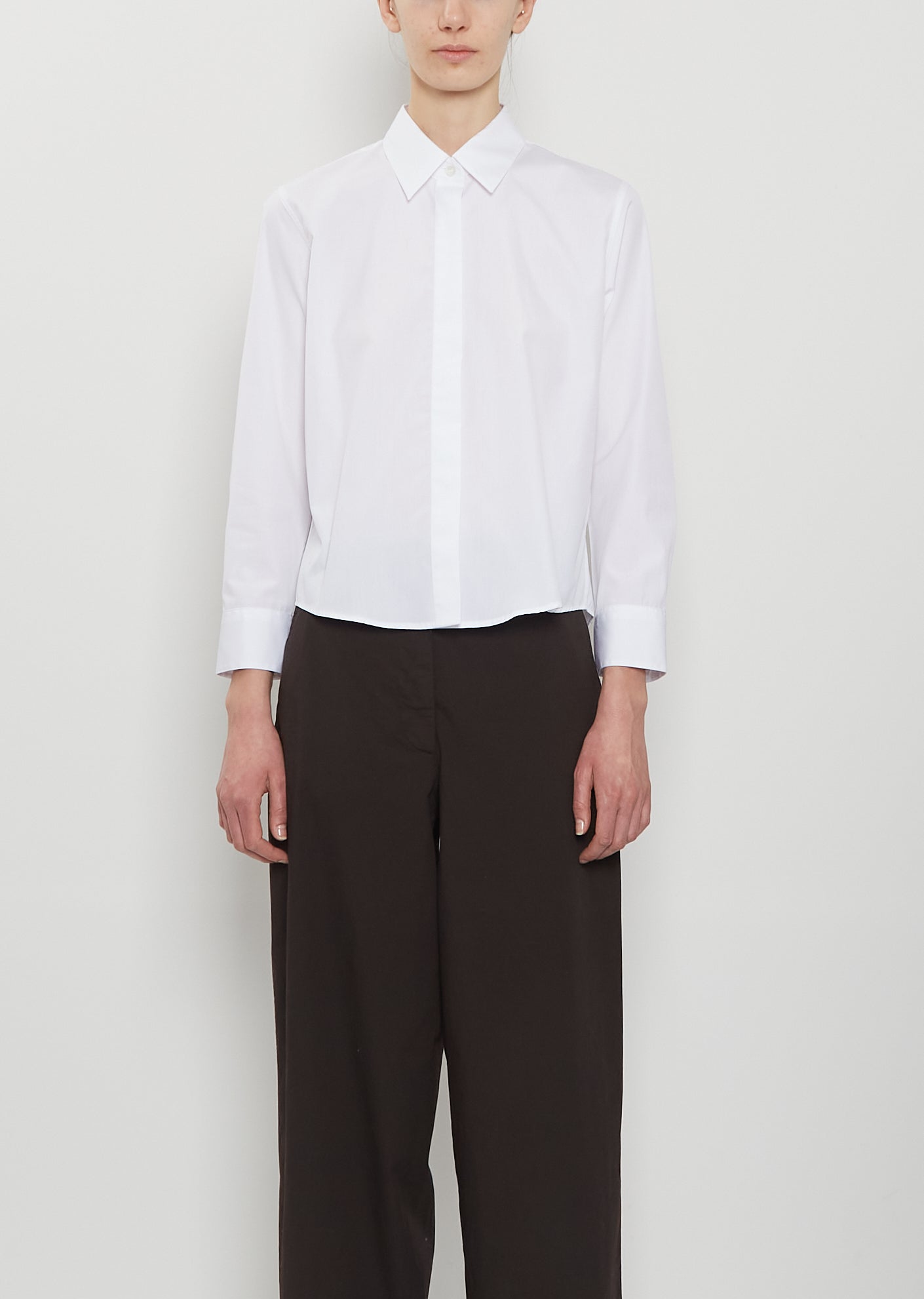 Dries Van Noten white signature slightly cropped shirt with a concealed buttoned placket and pointed collar in crisp cotton poplin. Features a single visible button at neck, buttoned cuffs, curved shirttail and box pleat at back yoke.
