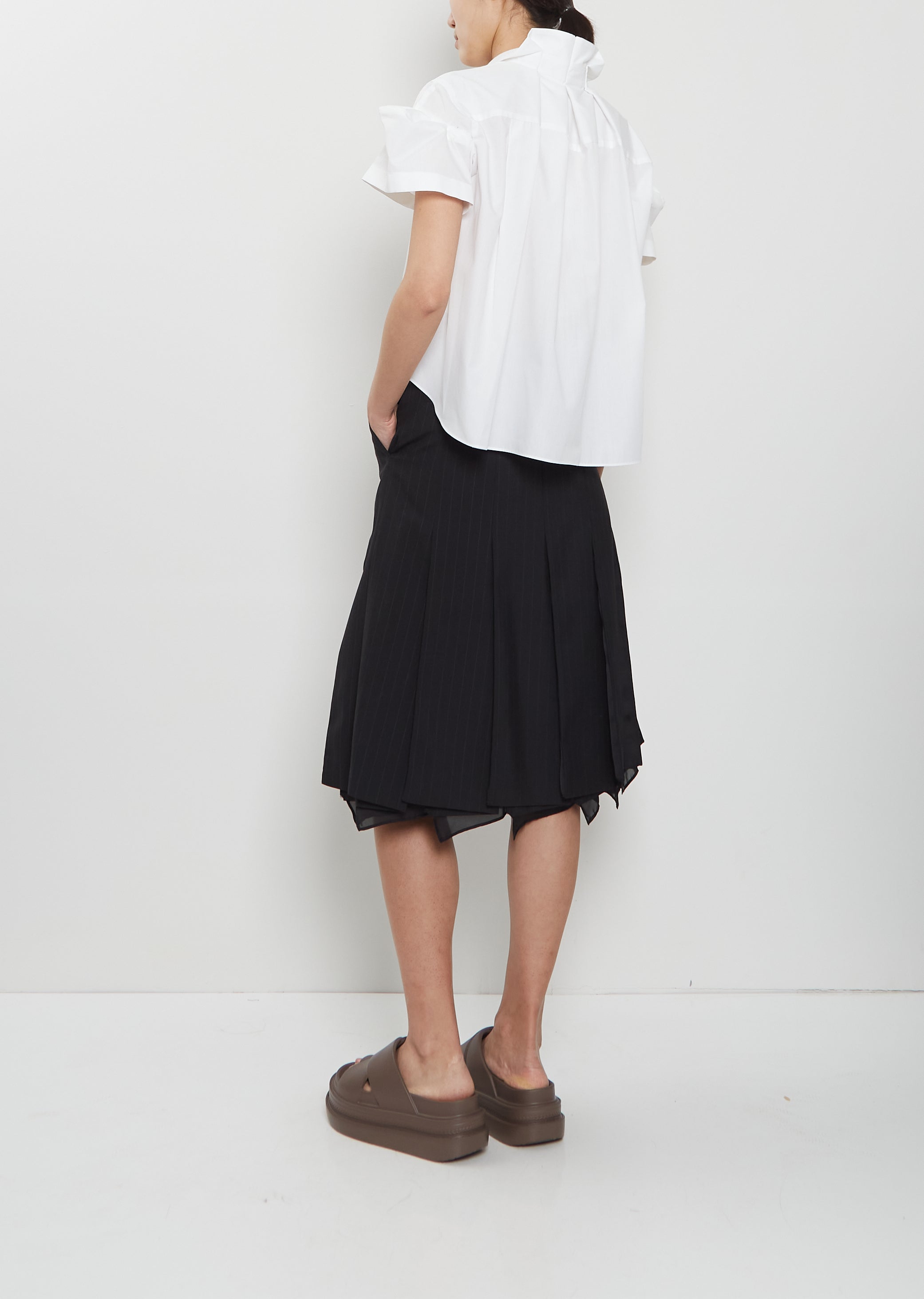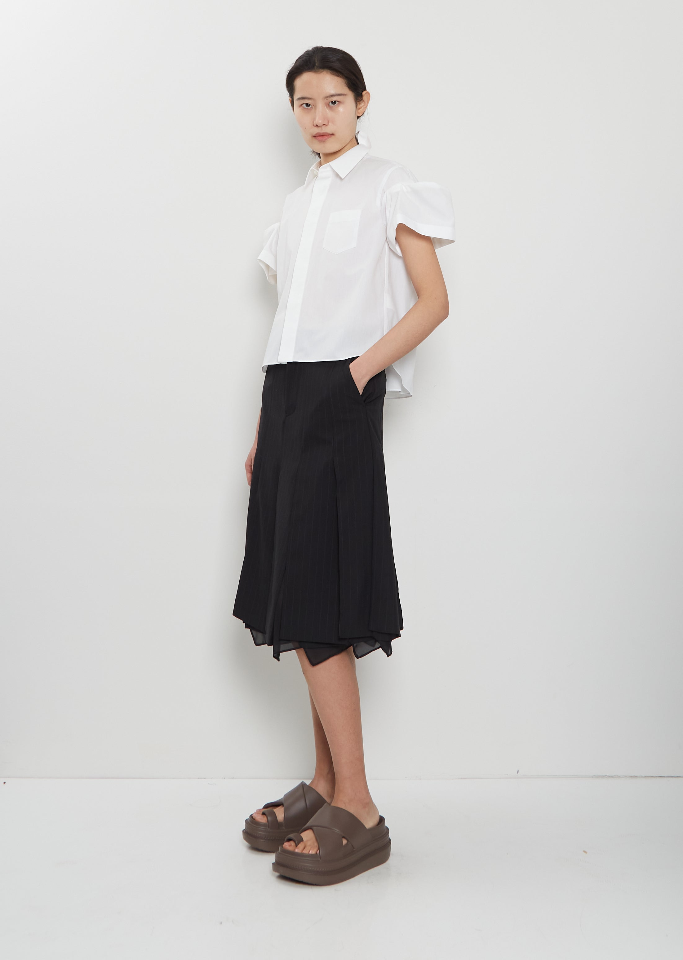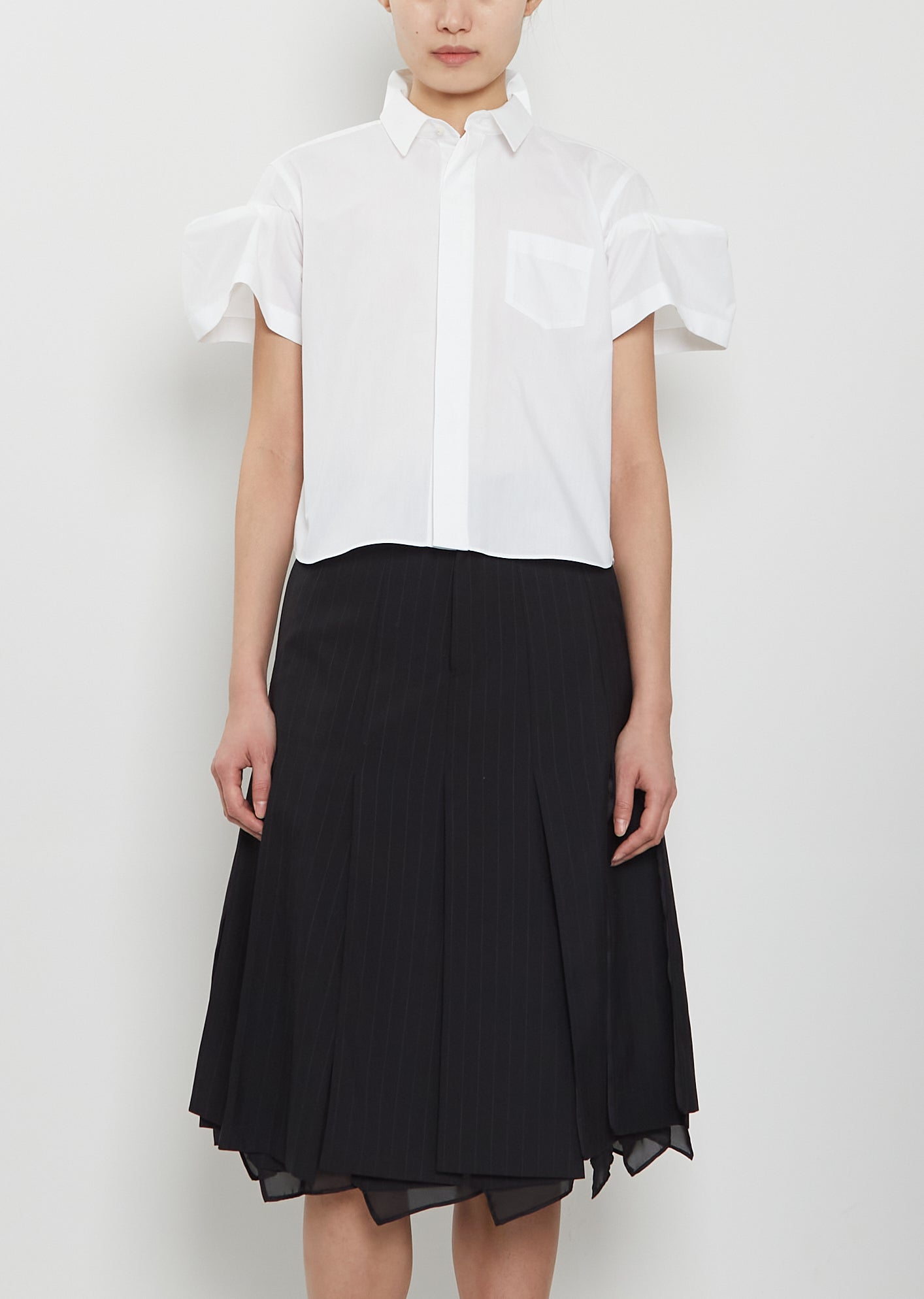 Sacai off white short sleeve cropped shirt with pleated puff sleeves and classic collar in crisp cotton blend poplin. Features box pleats at back stand collar, pleats at yoke, a single chest patch pocket, a curved shirttail and concealed shell-hued button closure at front. Regular fit.