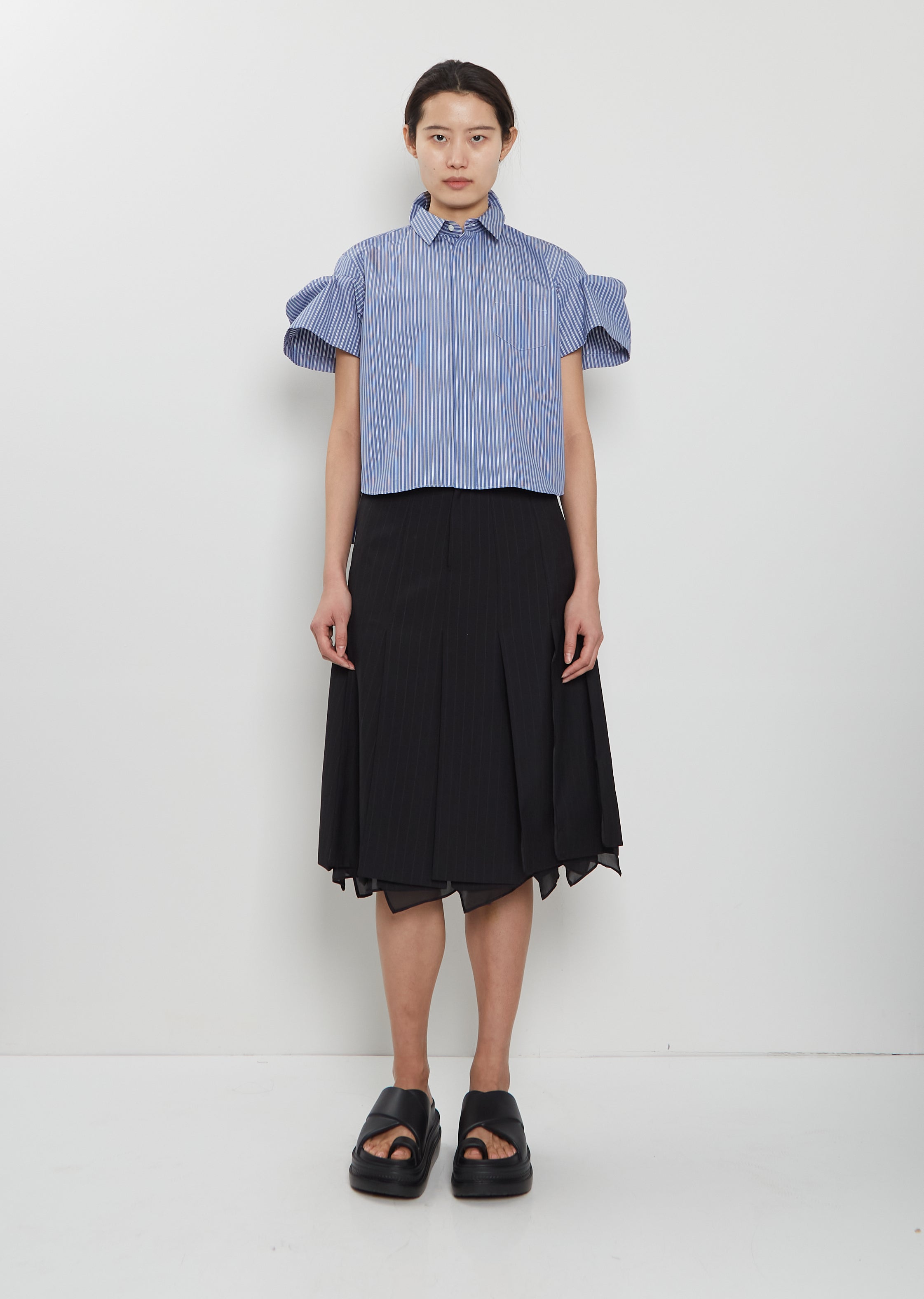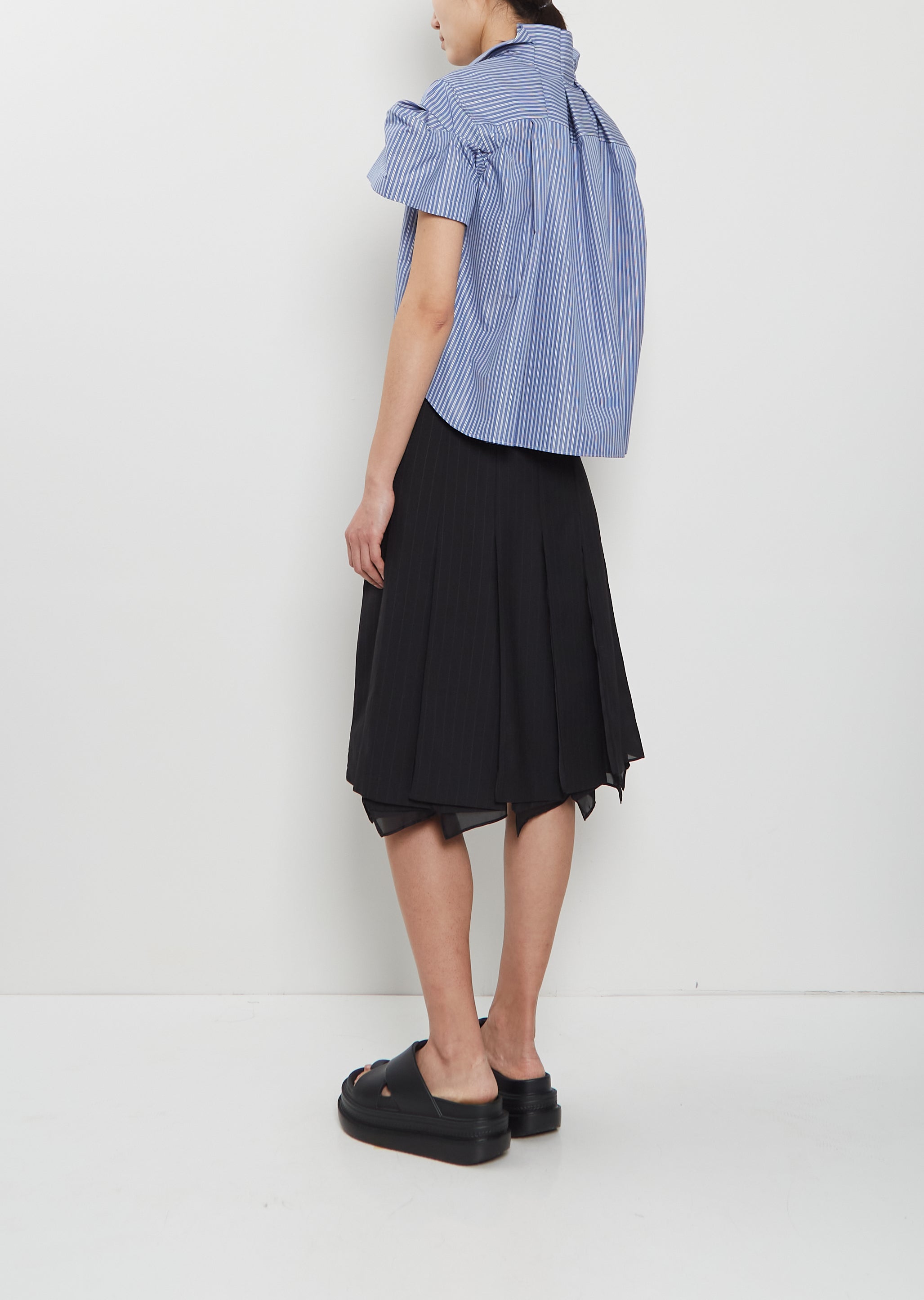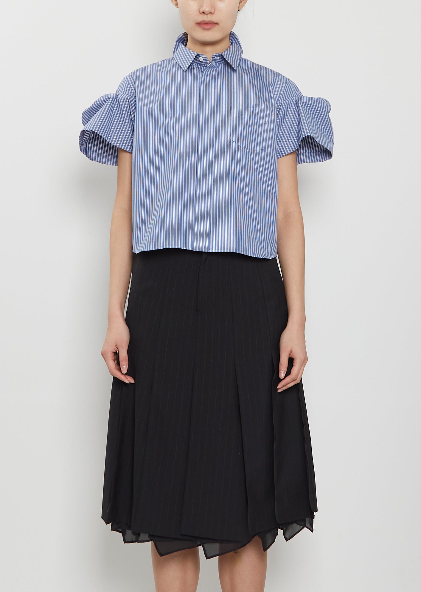 Sacai blue short sleeve cropped shirt with pleated puff sleeves and classic collar in crisp cotton blend poplin with white stripes. Features box pleats at back stand collar, pleats at yoke, a single chest patch pocket, a curved shirttail and concealed shell-hued button closure at front. Regular fit.