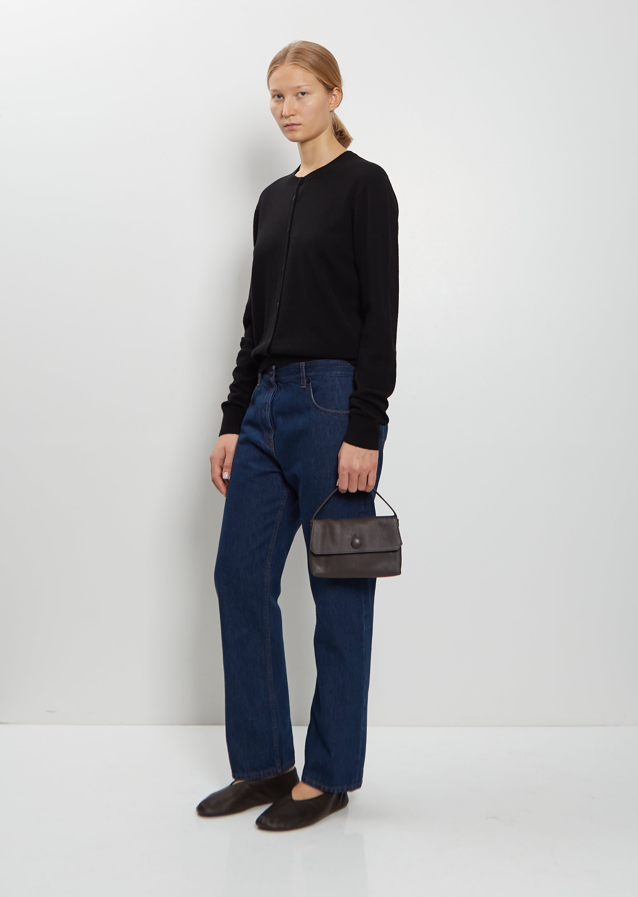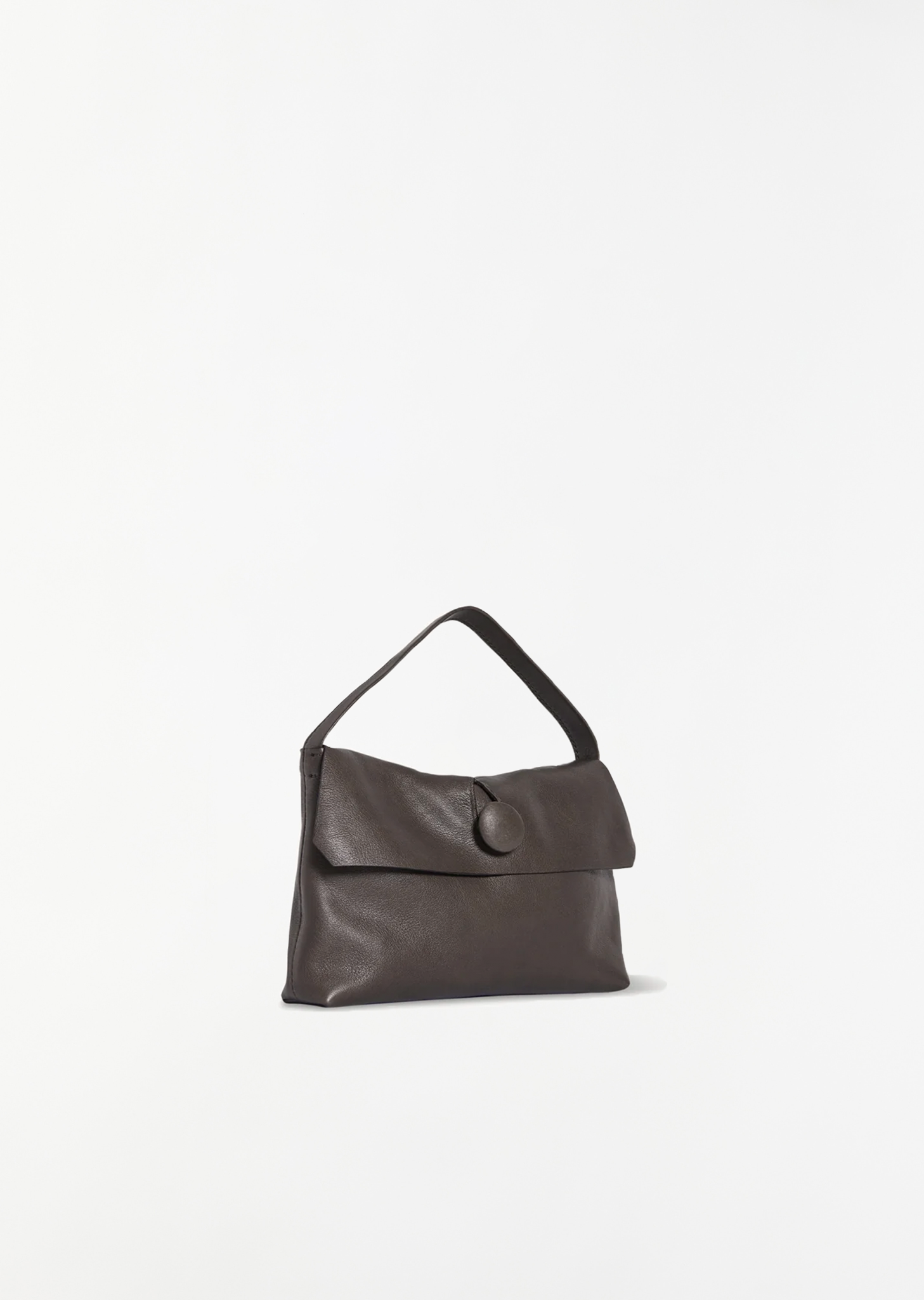 The Row dark taupe hand bag with a small top handle and leather covered button loop closure in grained nappa leather. Features a interior slip pocket. Lined in tonal suede.