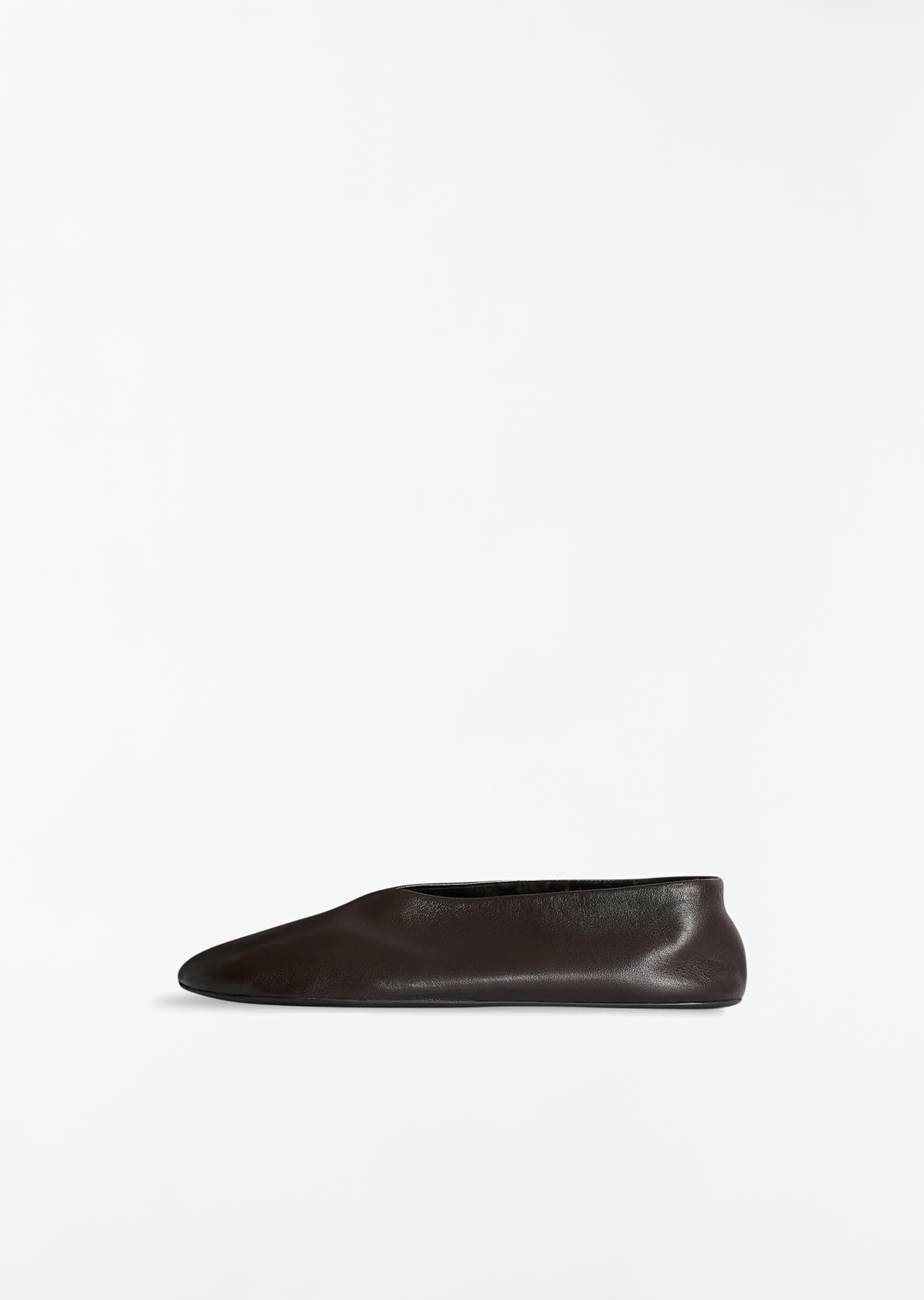 The Row lacquer brown slip-on flat with an oval toe, center front seam, and a flexible rubber-coated sole in ultra smooth nappa leather. Lined in soft tonal fur.