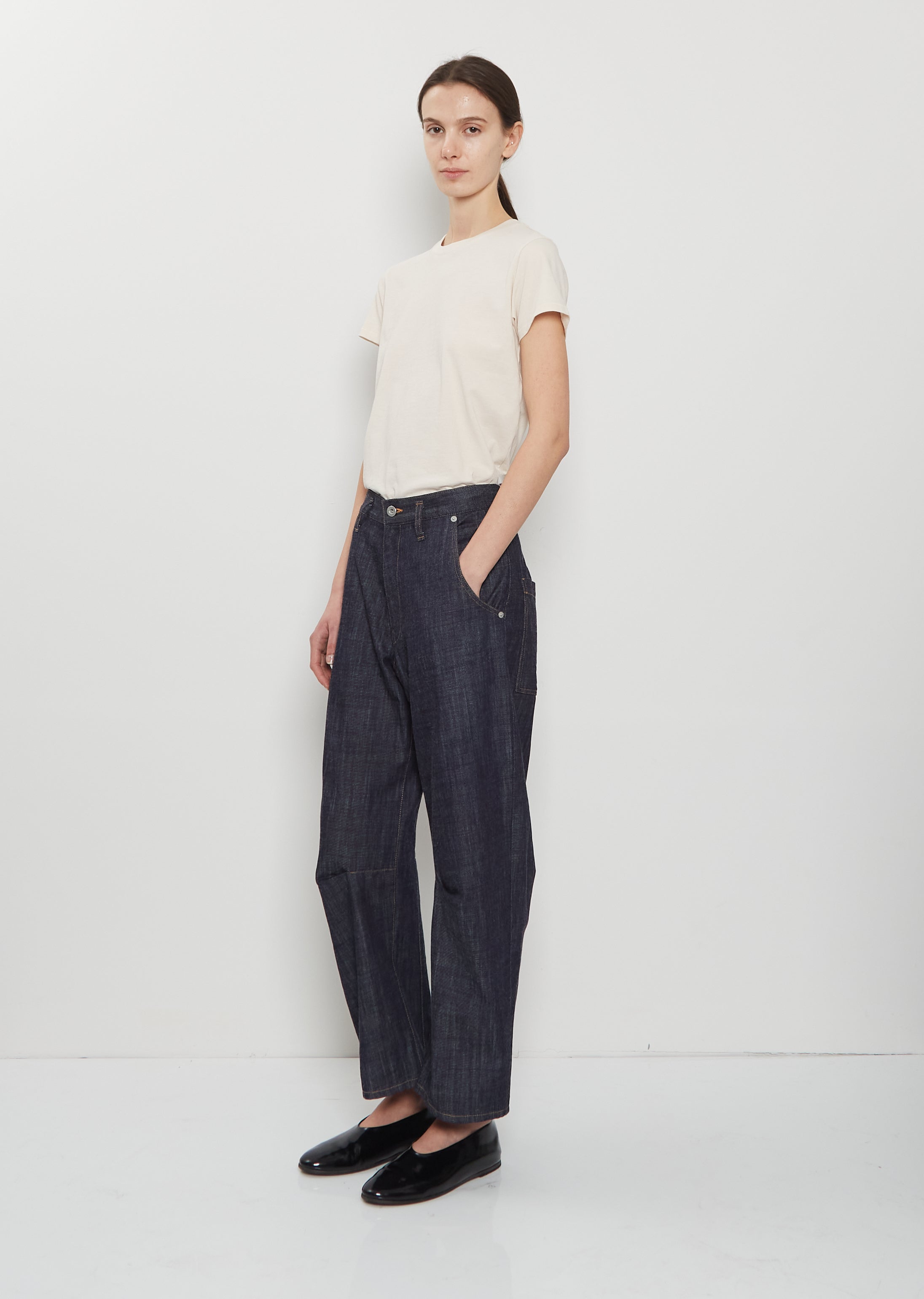 Y's signature mid-rise jeans with tapered, wide legs and detailed with gusset detailing at knees in  blue indigo raw denim. Features slant side pockets and oversized double patch pockets at back. Button and zip-fly fastening. Silver-tone hardware and rivet detailing. Belt loops. Relaxed fit.