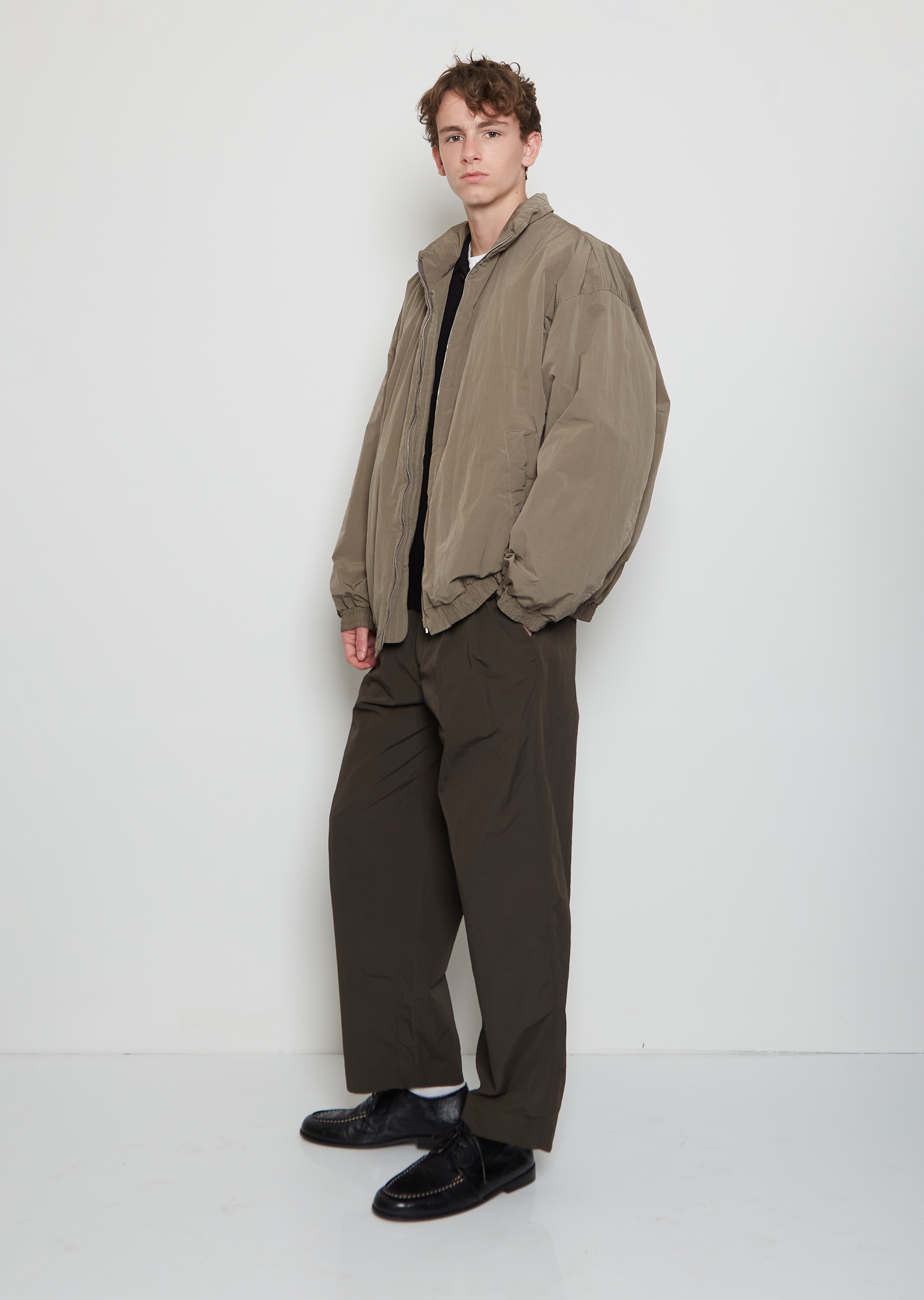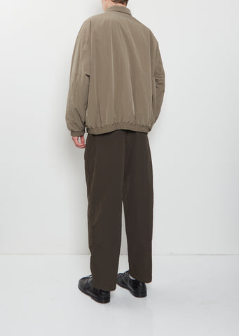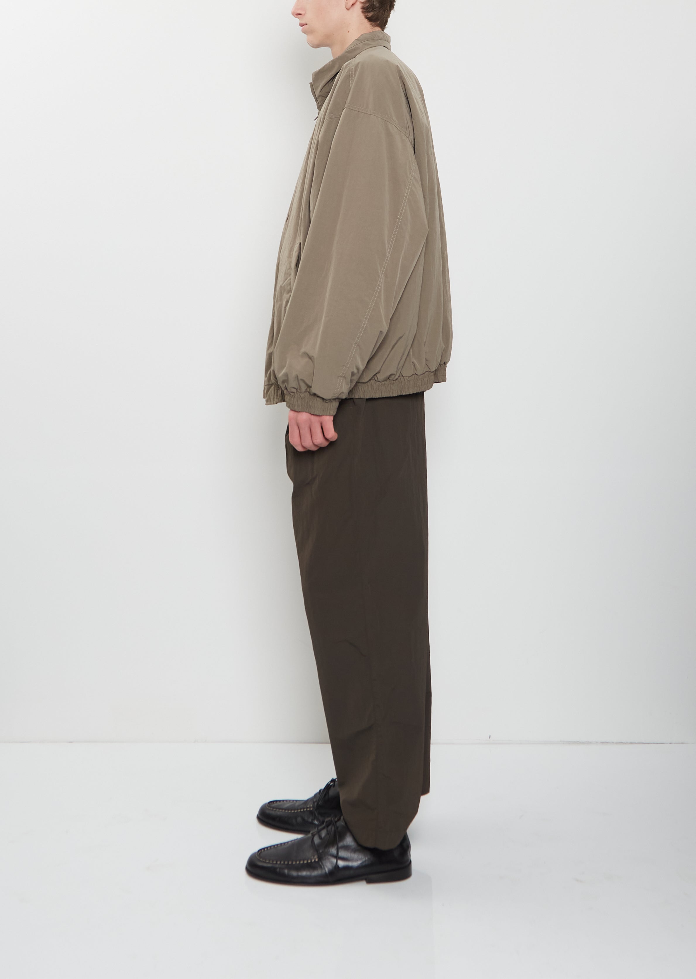 Ssstein taupe jacket with a stand collar and dropped shoulders in windproof padded technical nylon and cotton blend fabric. Features angled welt pockets, gathered detail at cuffs and hem, and a silver-toned zipper closure at front. Comes fully lined. Loose, relaxed fit.