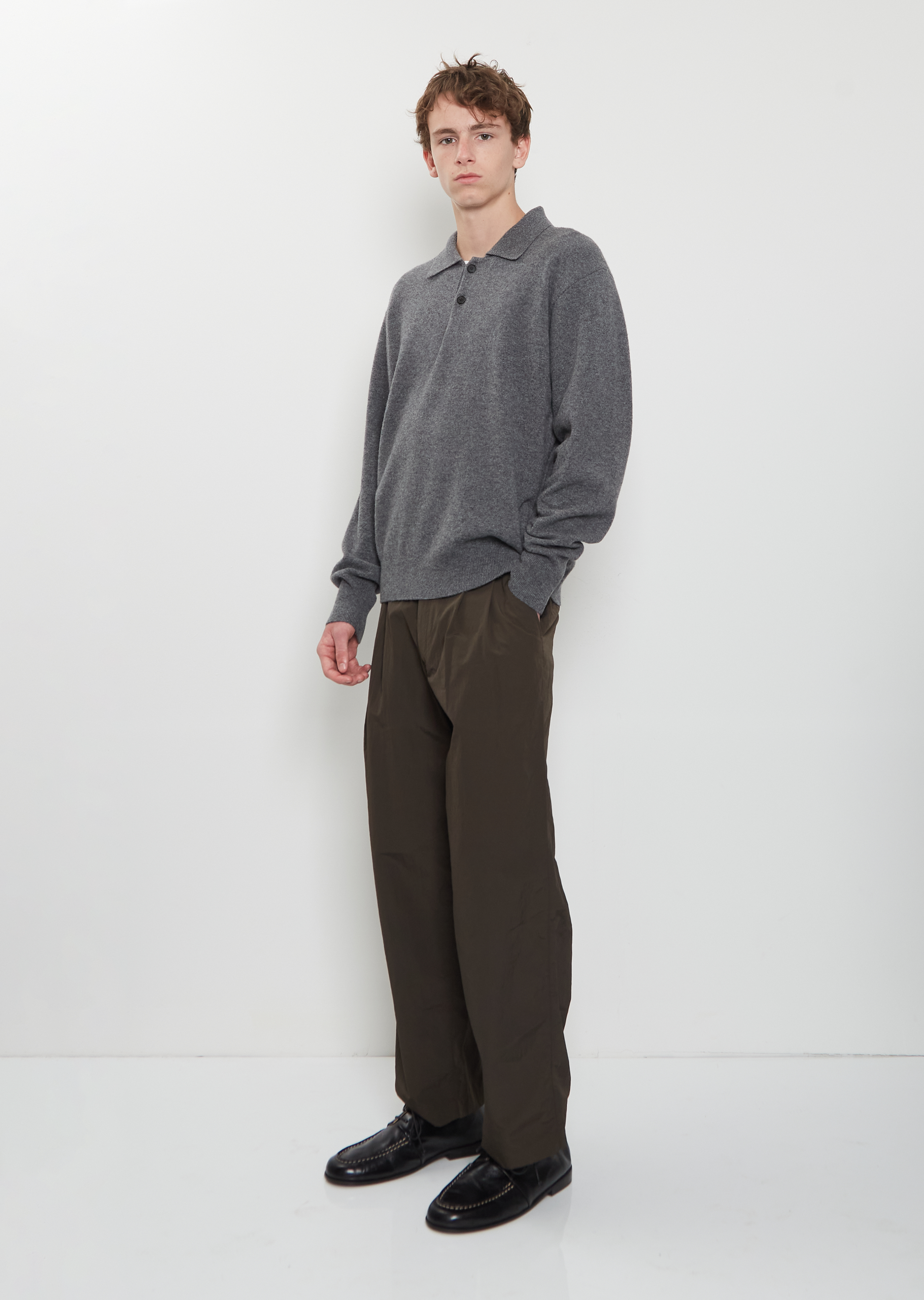 Ssstein grey polo sweater with a spread collar and two black buttons closure in fine merino lambswool knit. Features dropped shoulders and ribbed trim finishings at cuffs and hem. Relaxed fit.
