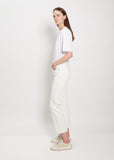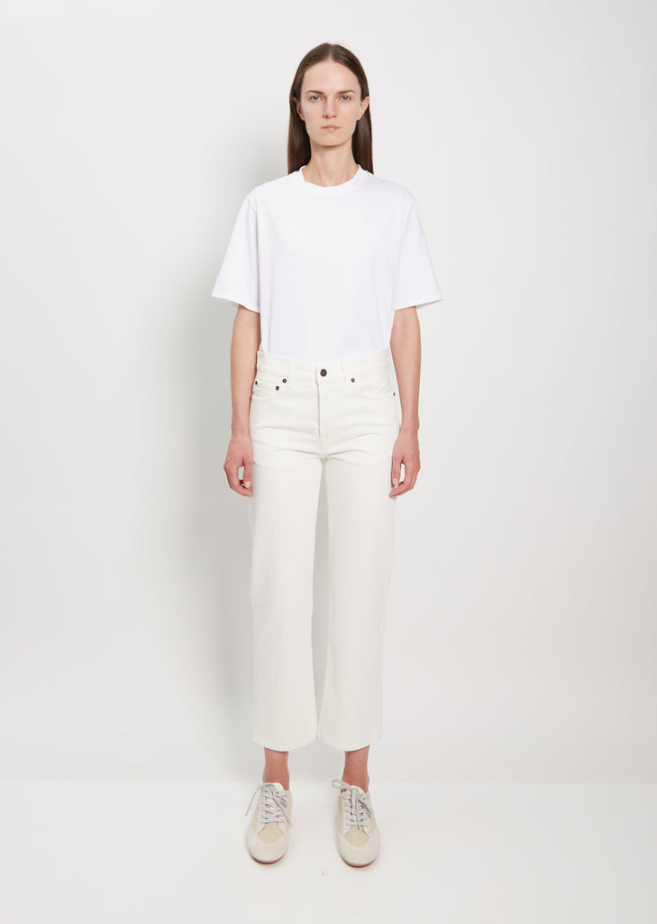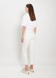 The Row white mid-rise ankle length 5-pocket jean in cotton denim with slim fit, straight leg, and subtly flared hem.