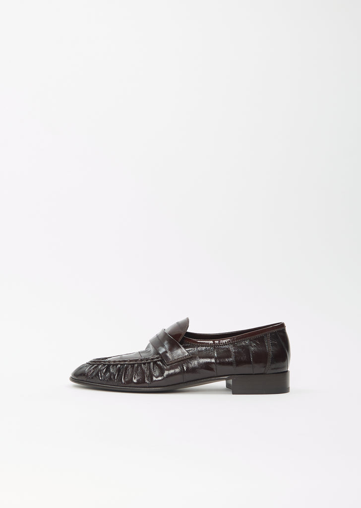 The Row brown artisanally-crafted loafer with natural pleating effect in paneled eelskin leather. Features a hand-painted leather sole and a stacked wooden heel.