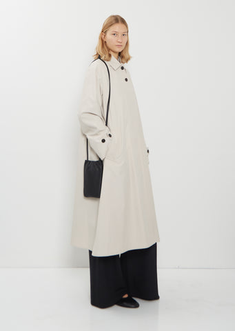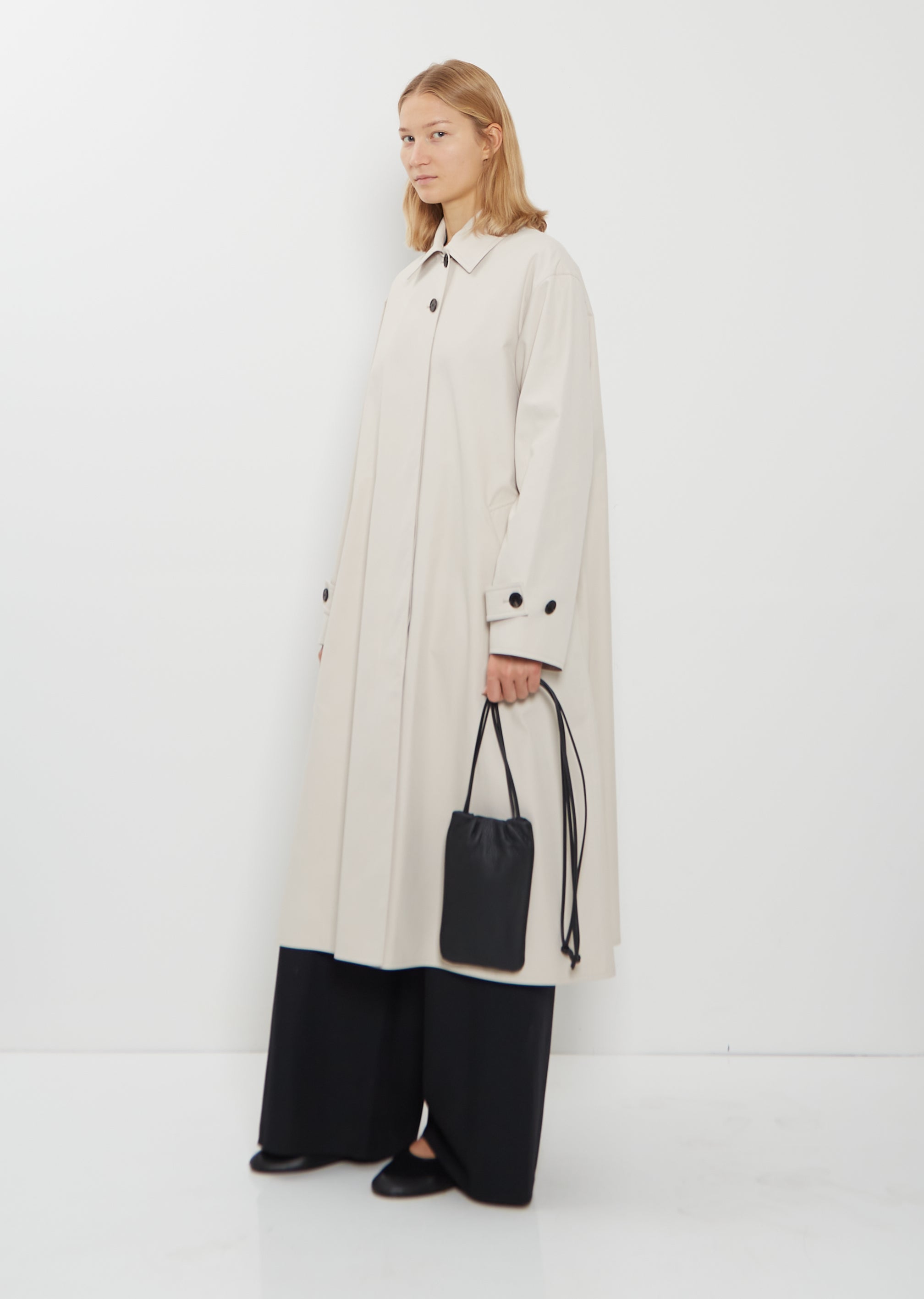 The Row black ruched phone case with knotted double shoulder straps in lux grained leather. Features a magnetic interior closure. Lined in tonal leather.
