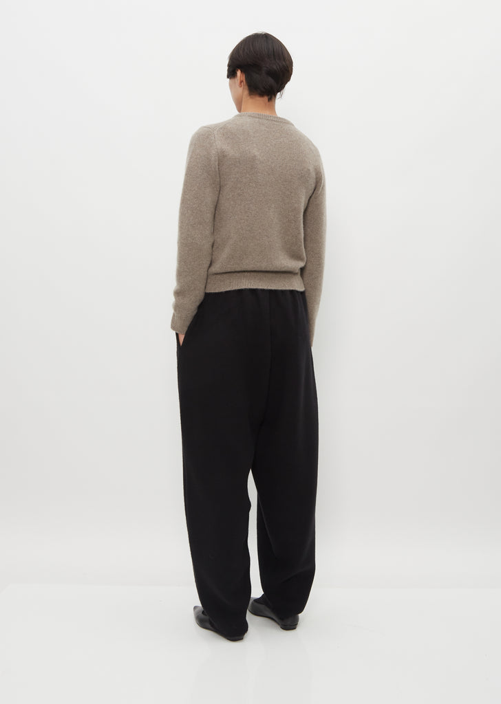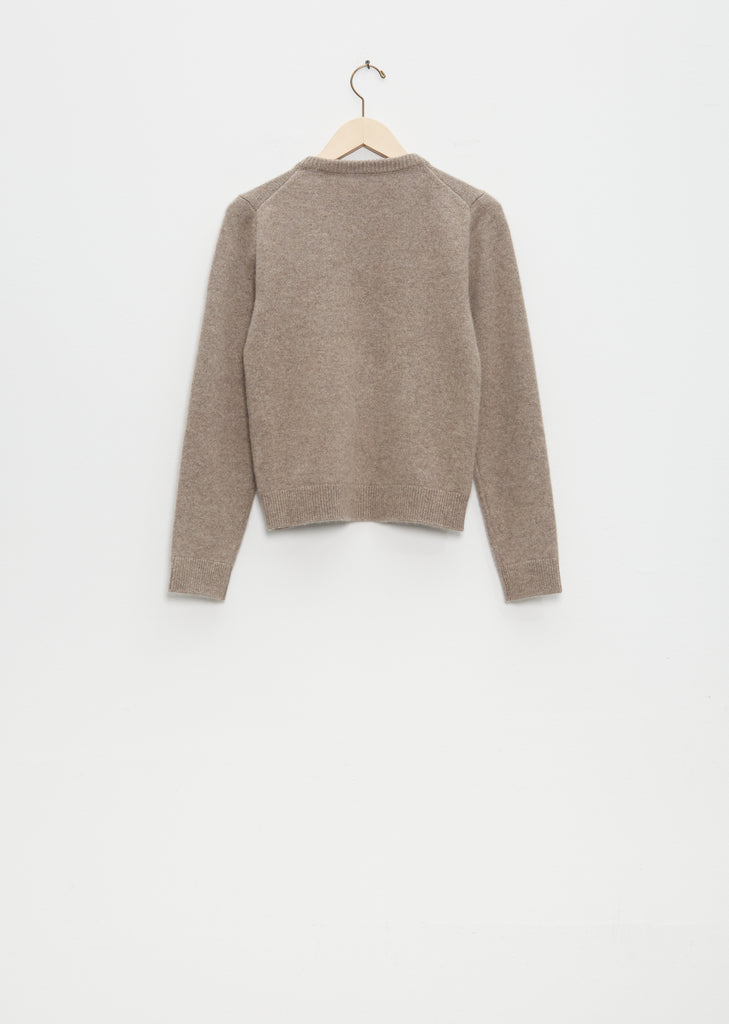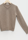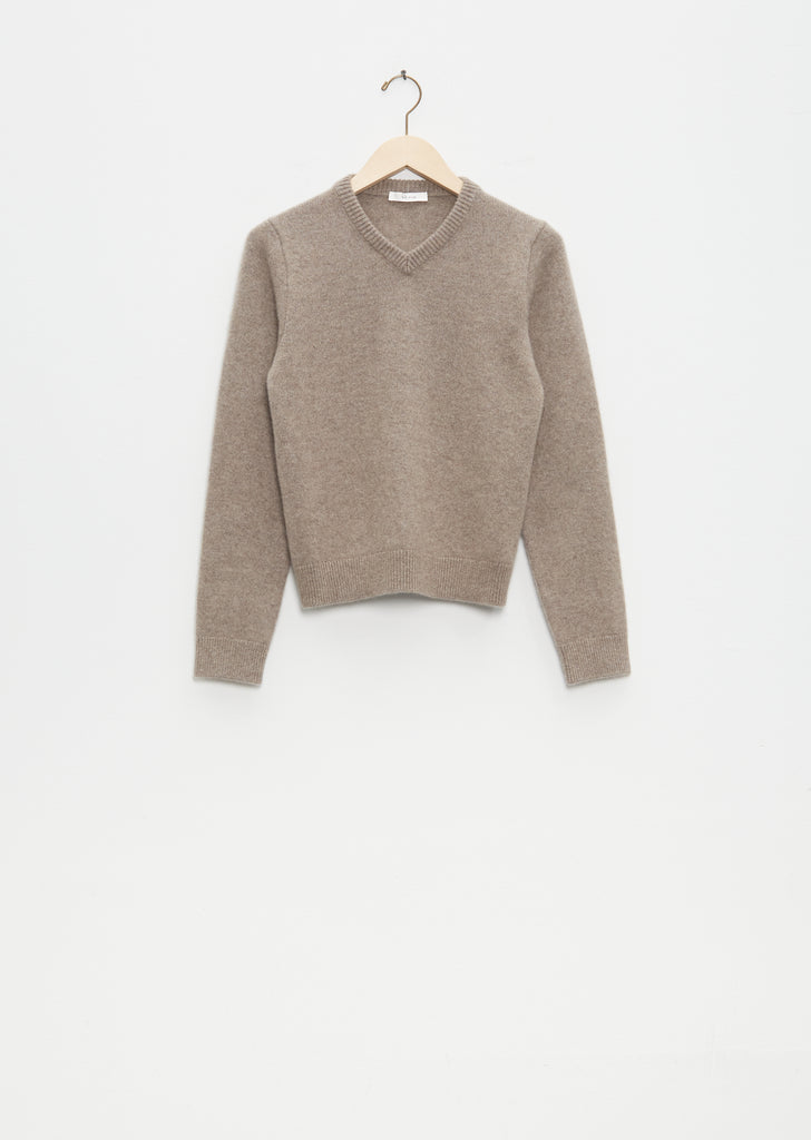 The Row dirt brown v-neck sweater in soft midweight cashmere knit. Features a slightly cropped fit and ribbed neck, cuffs and hem.