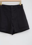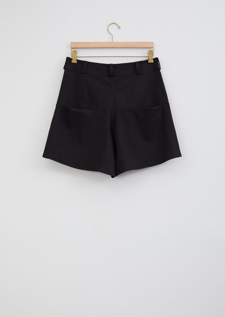 Toogood Marchinist Short in Flint (black) are suiting shorts in a linen & viscose blend with two oversized patch  overlay detailing at front and seamed pockets at back. Coordinates with The Editor Jacket in the same fabric for a fresh summer suit.