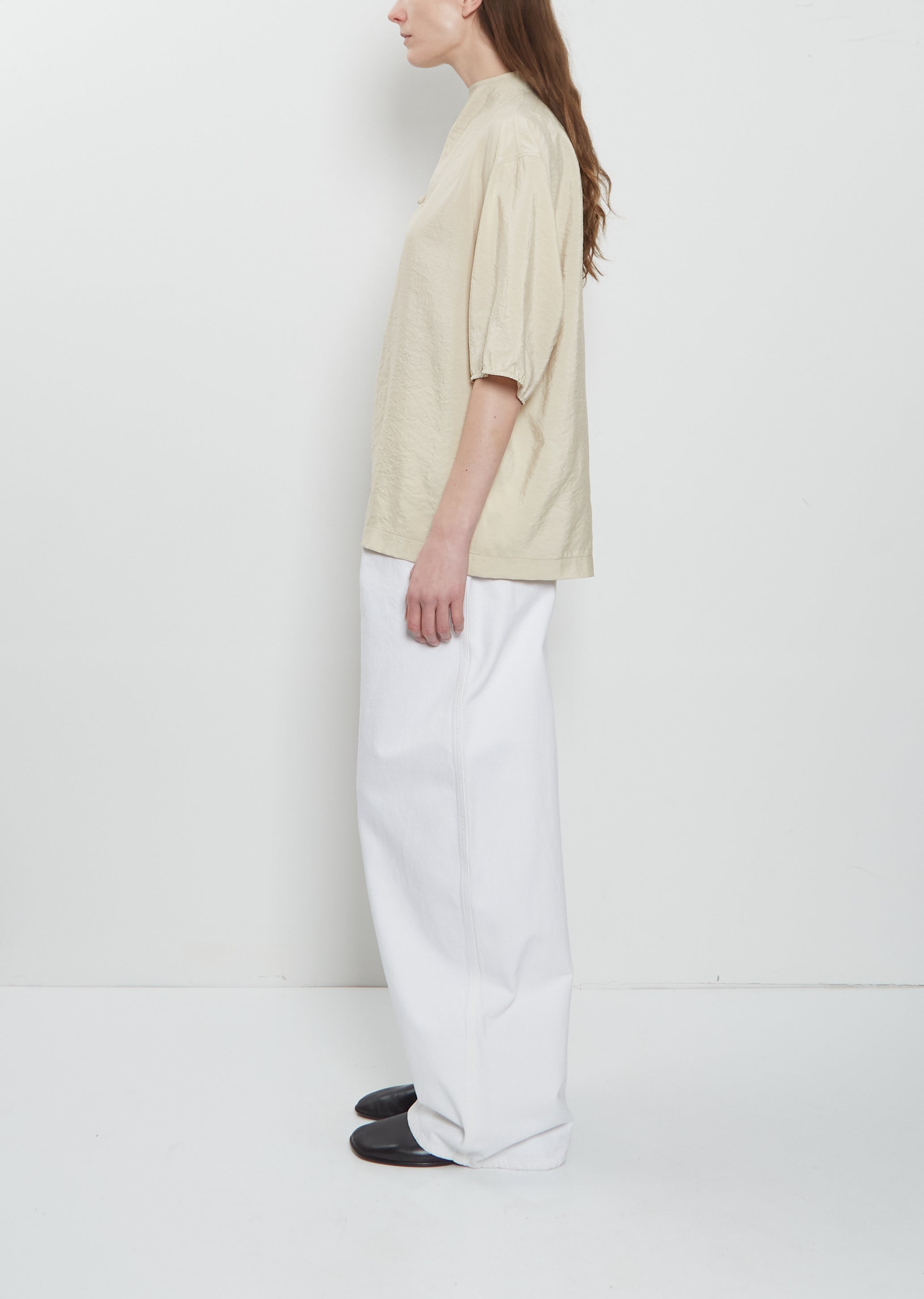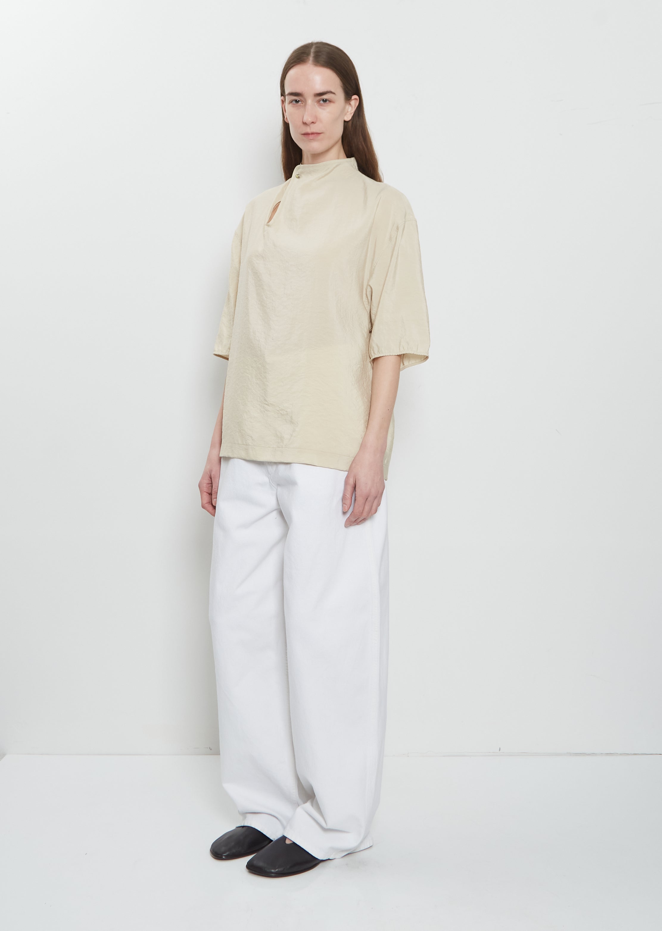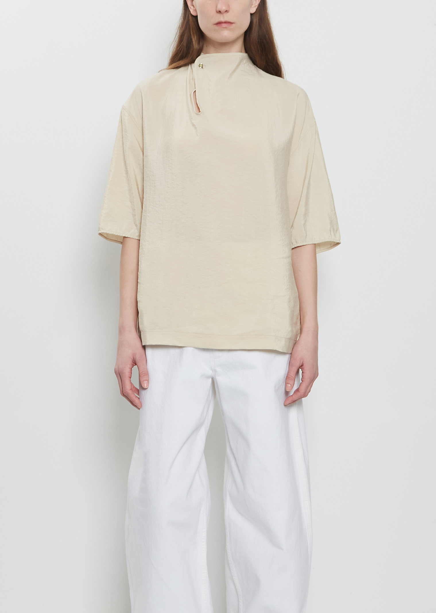 Lemaire cream top with a jewel button detail at neck in a dry silk blend with a slightly shiny and crinkled texture. Features a high soft collar with asymmetrical side closure, and 3/4 sleeves kimono sleeves. Fluid, regular fit.