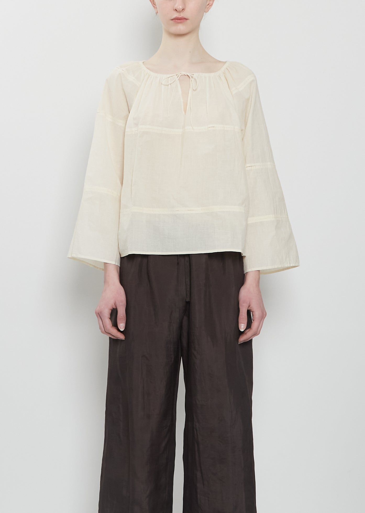 dosa cream long sleeve paneled blouse with an adjustable drawstring at round neckline in lightweight and fine khadi cotton. Features tonal stitching between panels and wide raglan sleeves. Relaxed fit.