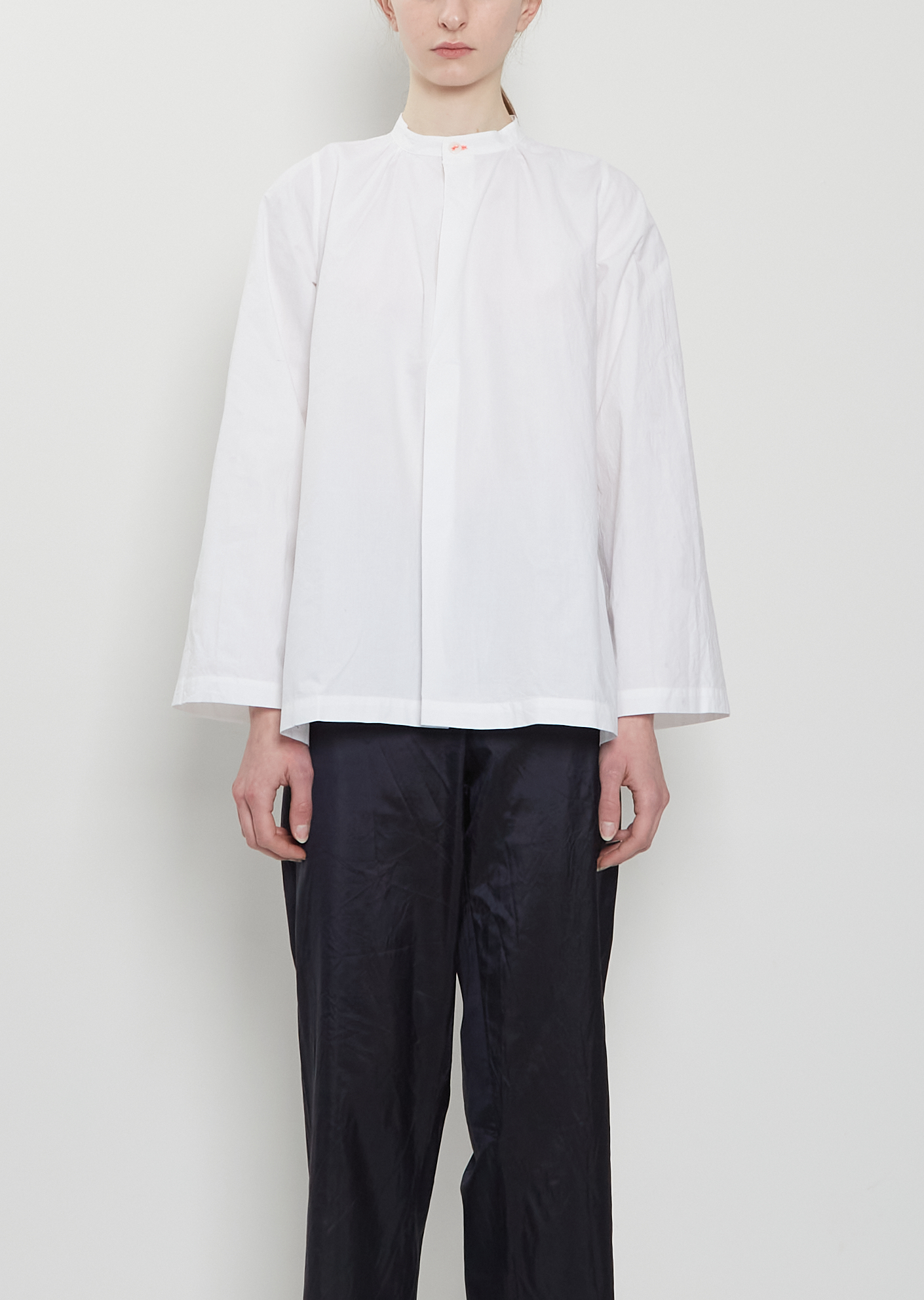 dosa white top with a band collar and a single button closure at neck in a dense khadi cotton. Features set-in shoulders and a pleat at front. Relaxed fit.