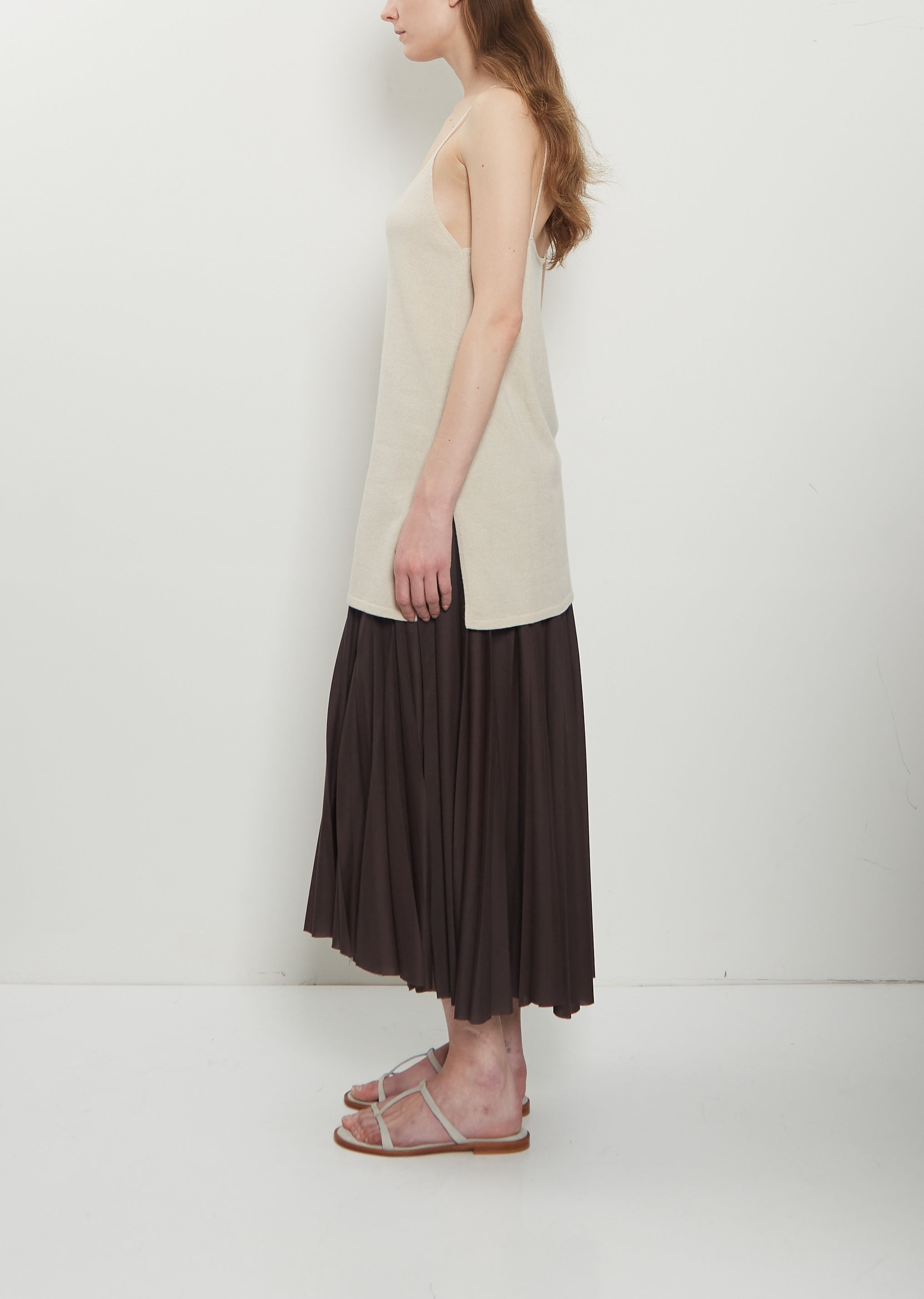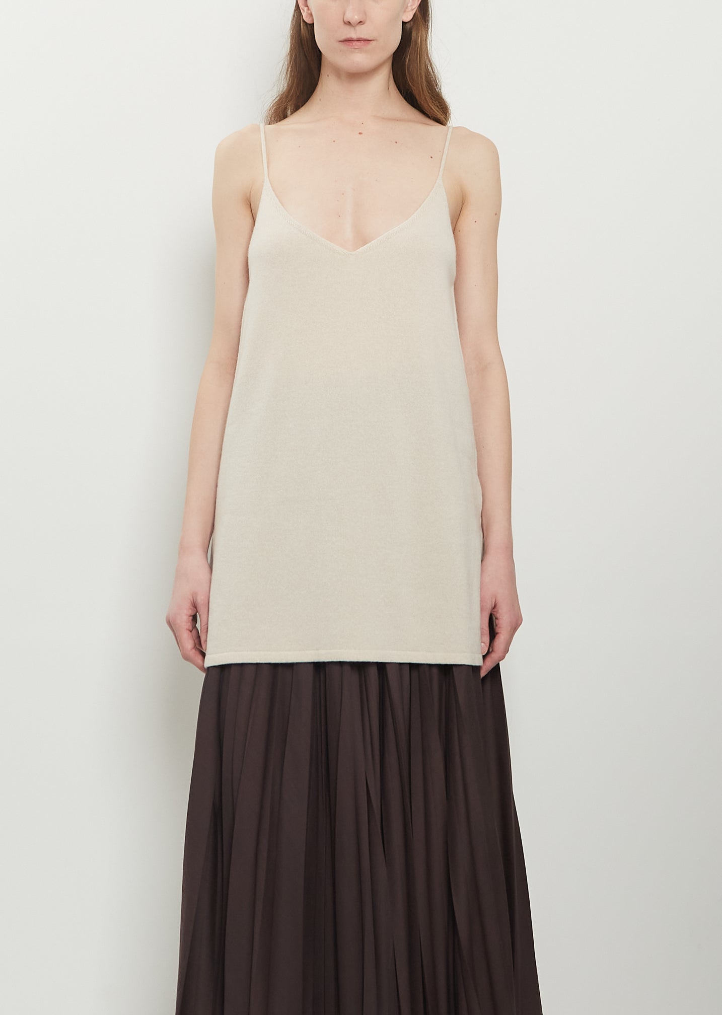 Dušan cream camisole top with a deep V-neckline and delicate thin straps in a soft and lightweight cashmere knit. Elongated silhouette, relaxed fit.