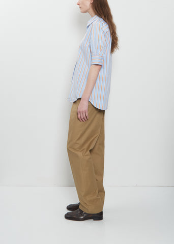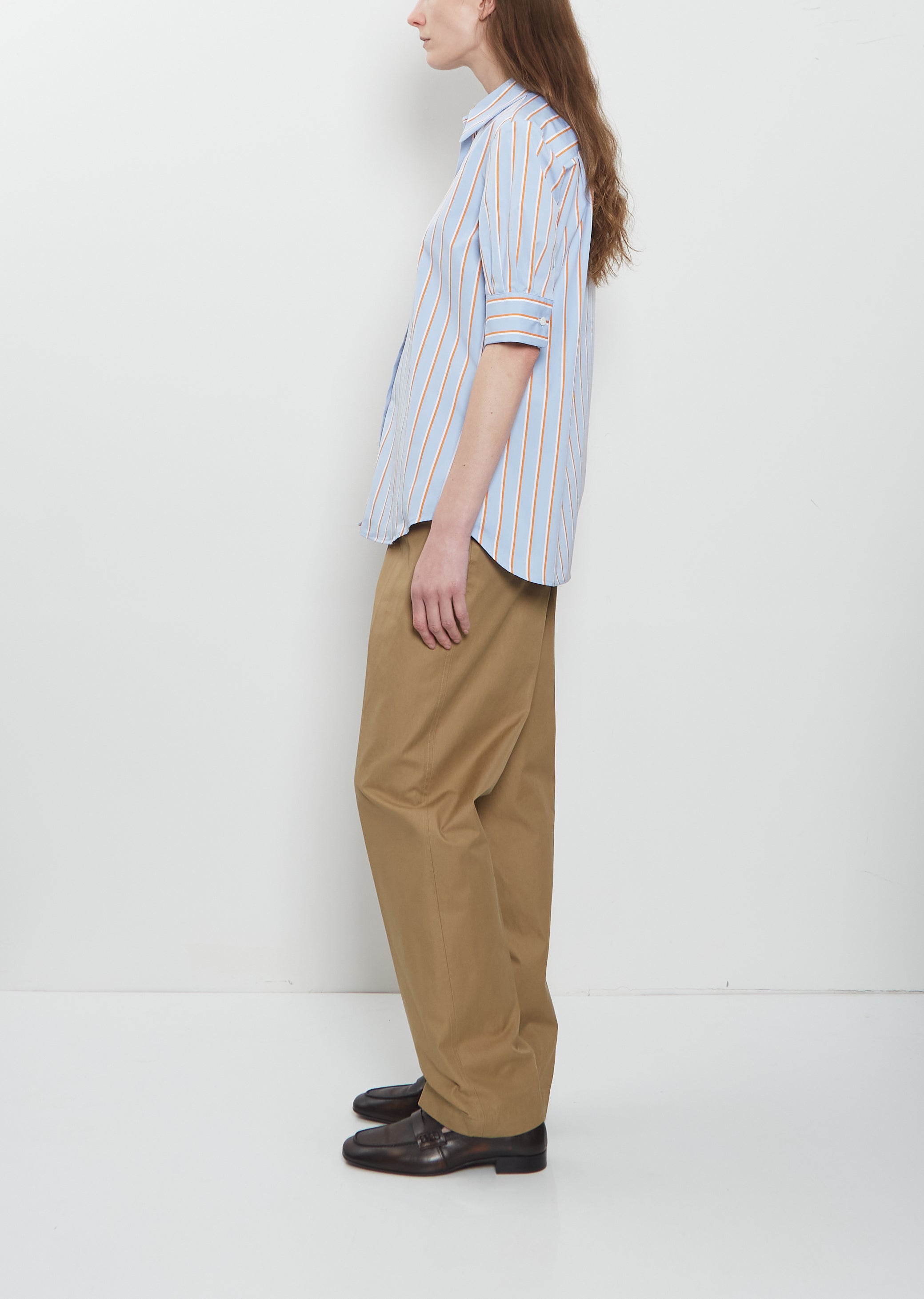 Dries Van Noten light blue, white and orange stripes shirt with half sleeves and pleated detail at cuffs in crisp and soft cotton poplin. Features a point collar, set-in shoulders, pleats at back yoke, curved shirttail and a shell-hued buttons closure at front.