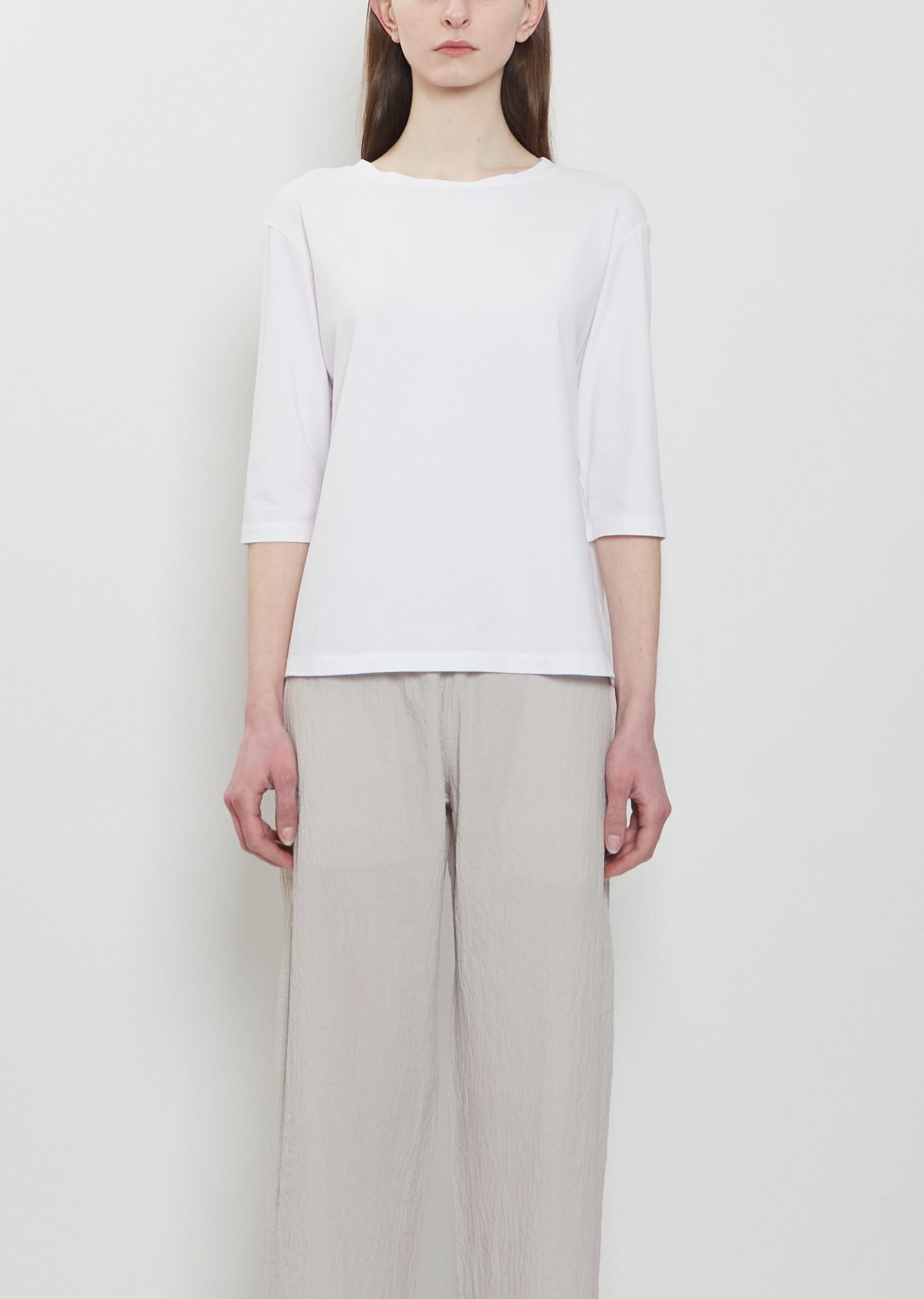 Labo.Art white t-shirt with a crew neck and half sleeves in a lightweight and soft stretch cotton jersey. Features a raw-edge finish at hem and sleeves. Relaxed fit.