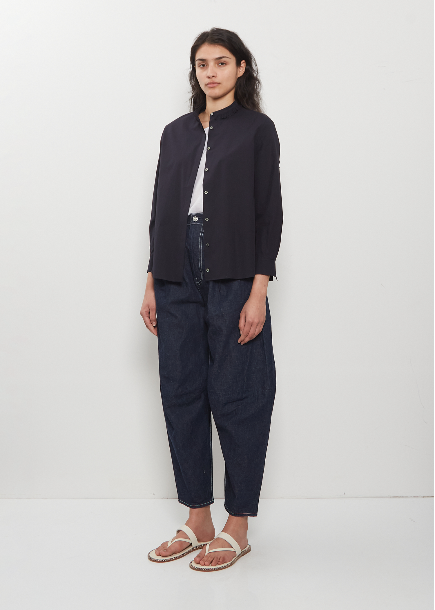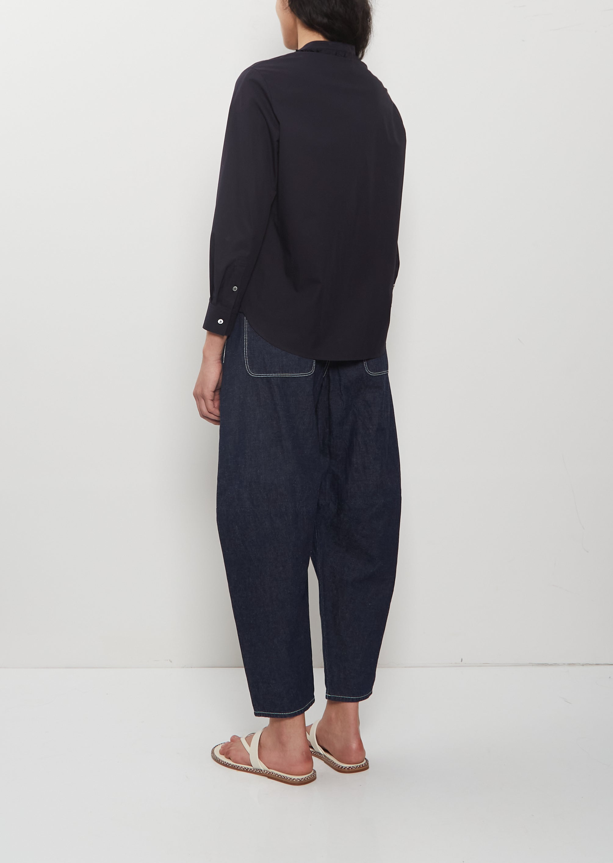 Minä Perhonen navy long sleeve shirt with a double layered ruffle detail at small collar in high density and mercerized cotton poplin. Features buttoned cuffs, a curved shirttail and a concealed nacre-hued button placket. Regular fit.