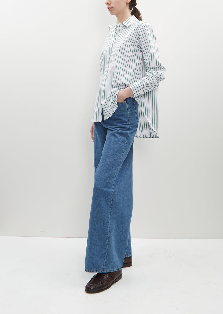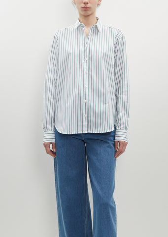 Brand Signature Piece — Totême white and pine green stripe signature shirt with a shirttail hem and back box pleat in organic cotton poplin. Detailed with embroidered monogram at front.