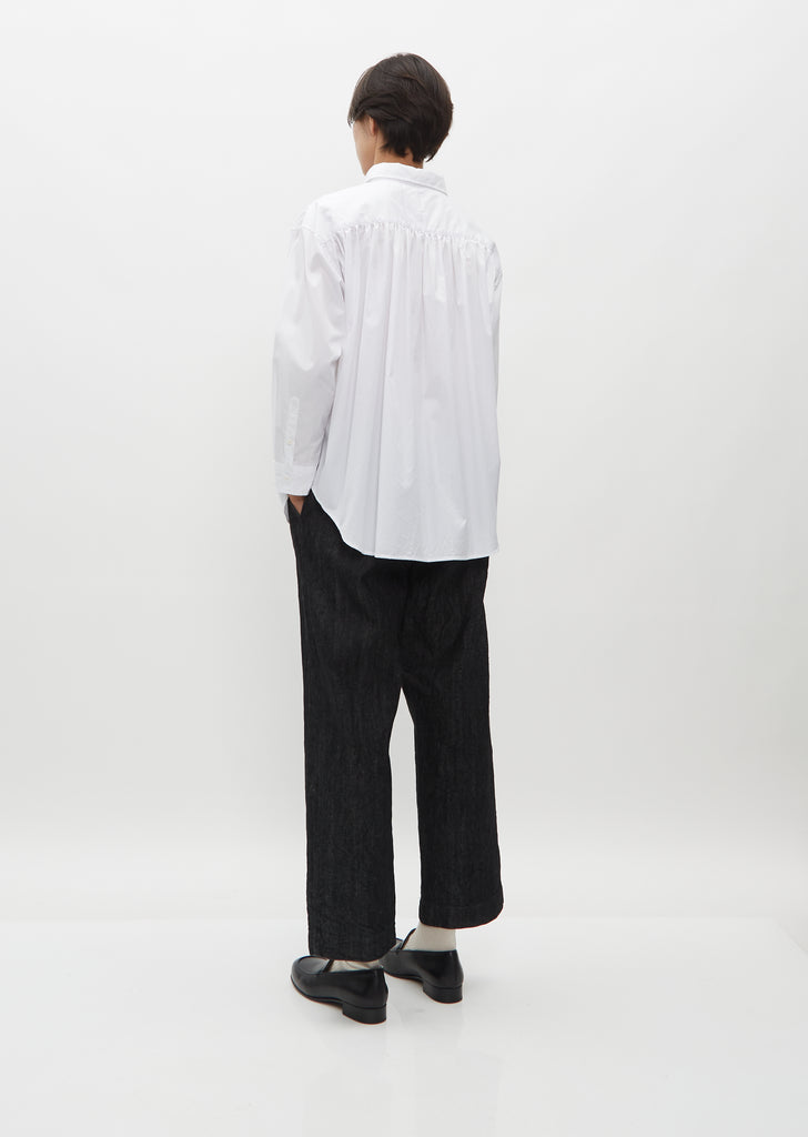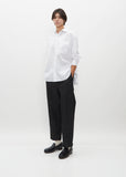 Toujours white shirt in cotton poplin. Features a gathered back, classic shirt collar, patch pocket, long buttoned sleeves and a button closure in front.